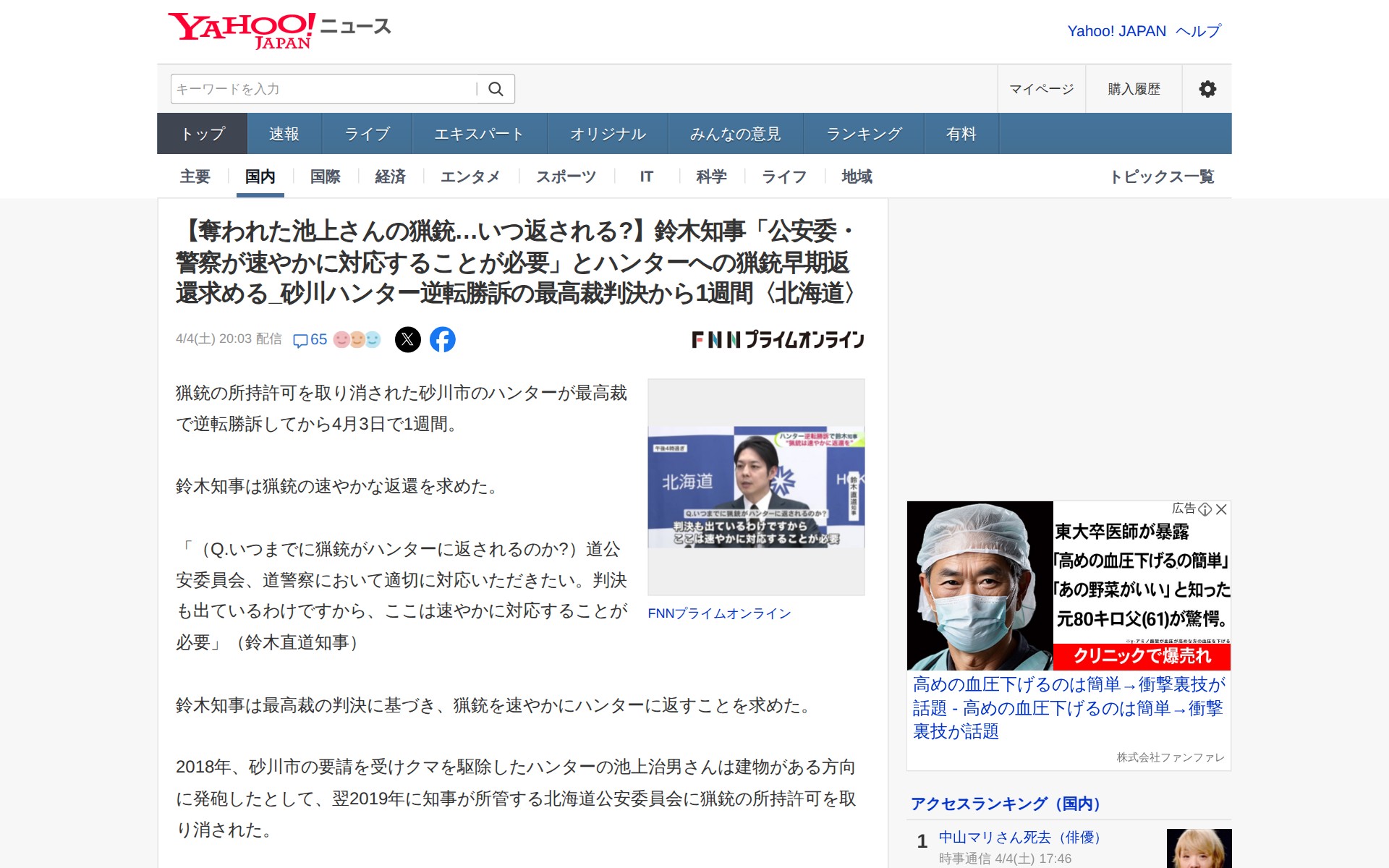 【奪われた池上さんの猟銃…いつ返される?】鈴木知事「公安委・警察が速やかに対応することが必要」とハンターへの猟銃早期返還求める_砂川ハンター逆転勝訴の最高裁判決から1週間〈北海道〉(FNNプライムオンライン) - Yahoo!ニュース - 保存されたスクリーンショット