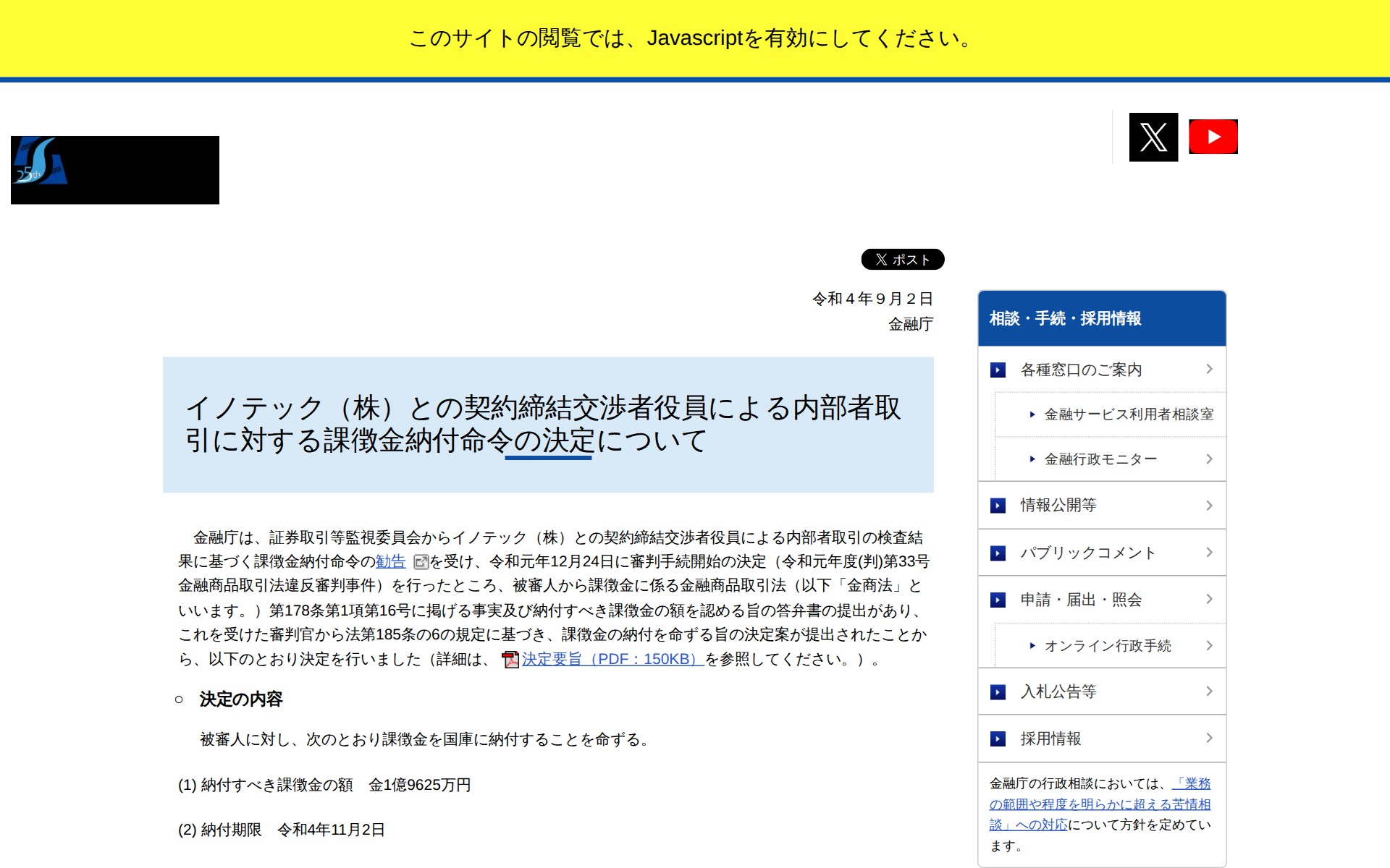 イノテック(株)との契約締結交渉者役員による内部者取引に対する課徴金納付命令の決定について:金融庁