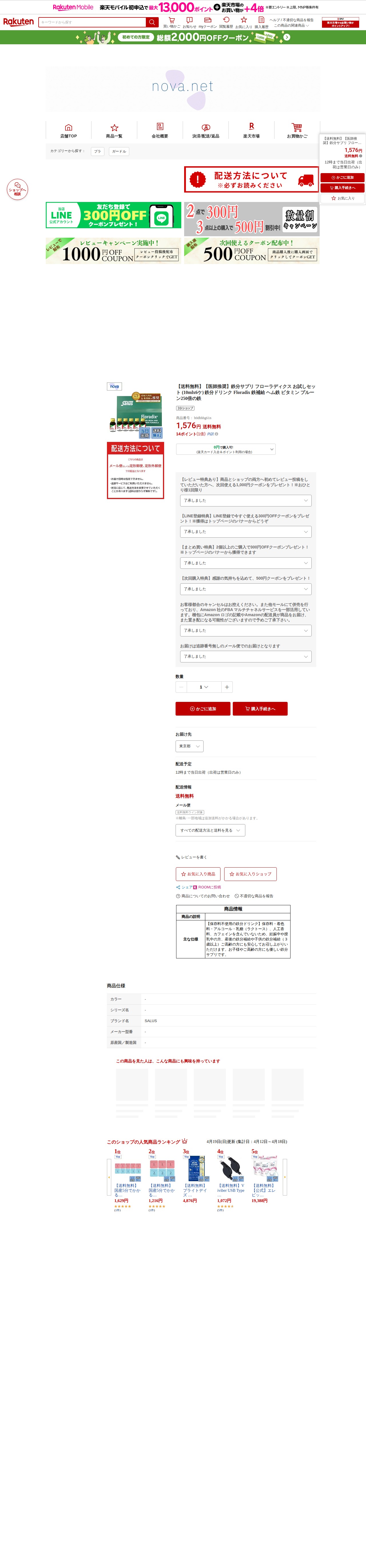 【楽天市場】【送料無料】【医師推奨】鉄分サプリ フローラディクス お試しセット (10mlx6ケ) 鉄分ドリンク Floradix 鉄補給 ヘム鉄 ビタミン プルーン250倍の鉄:nova - 保存されたスクリーンショット