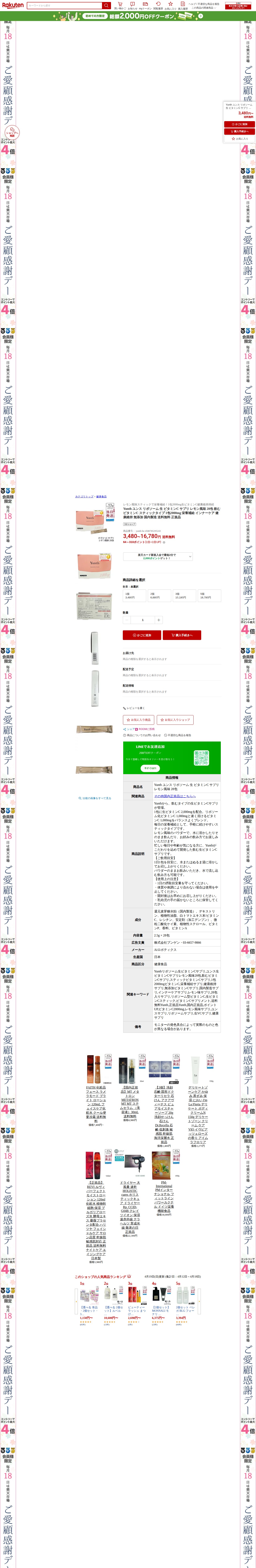 【楽天市場】Yunth ユンス リポソーム 生 ビタミンC サプリ レモン風味 28包 飲むビタミンC スティックタイプ 1包2000mg 栄養補給 インナーケア 健康維持 無添加 国内製造 送料無料 正規品:BUNGEN 楽天市場店 - 保存されたスクリーンショット