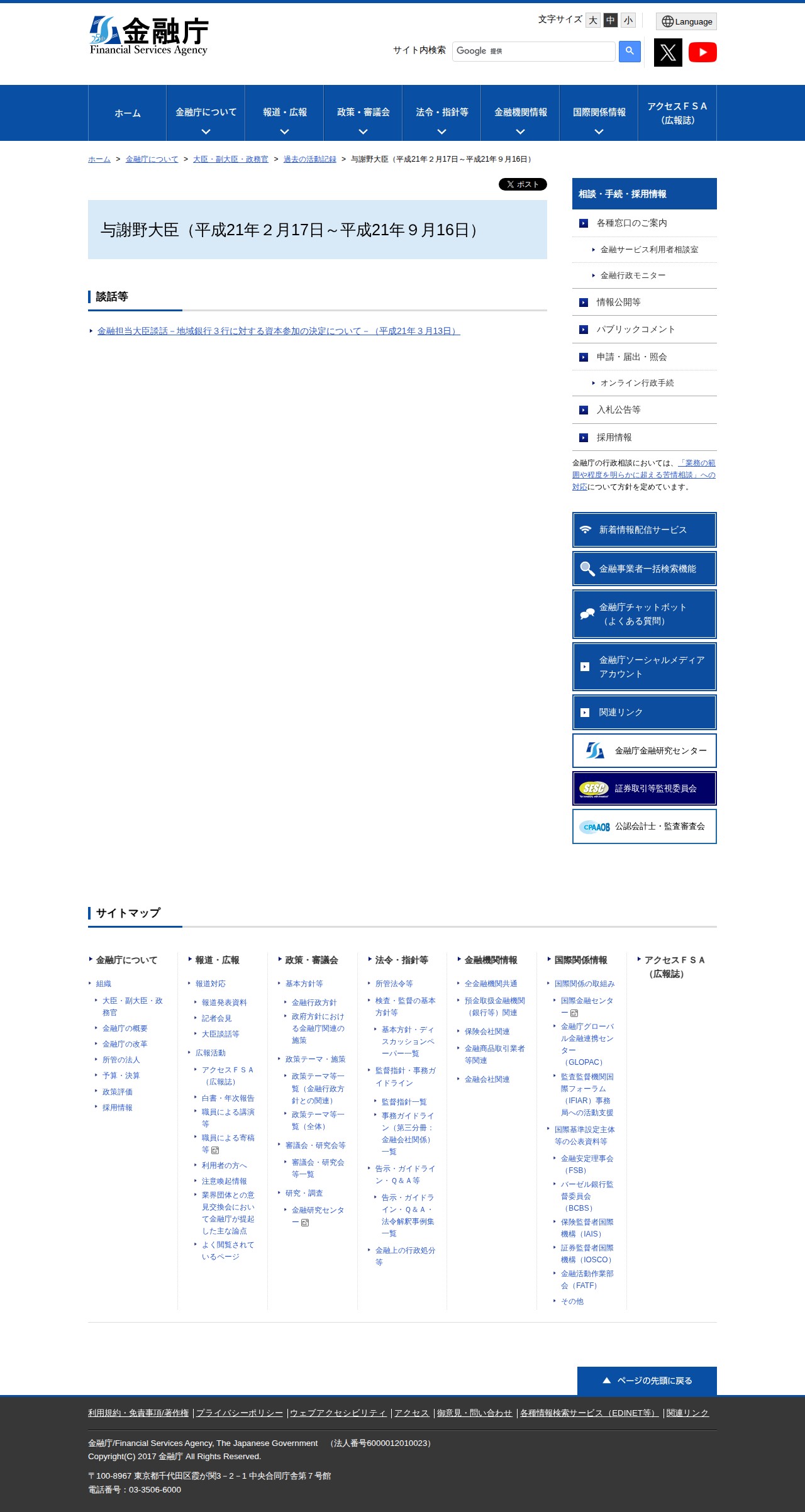 与謝野大臣(平成21年2月17日~平成21年9月16日):金融庁 - 保存されたスクリーンショット