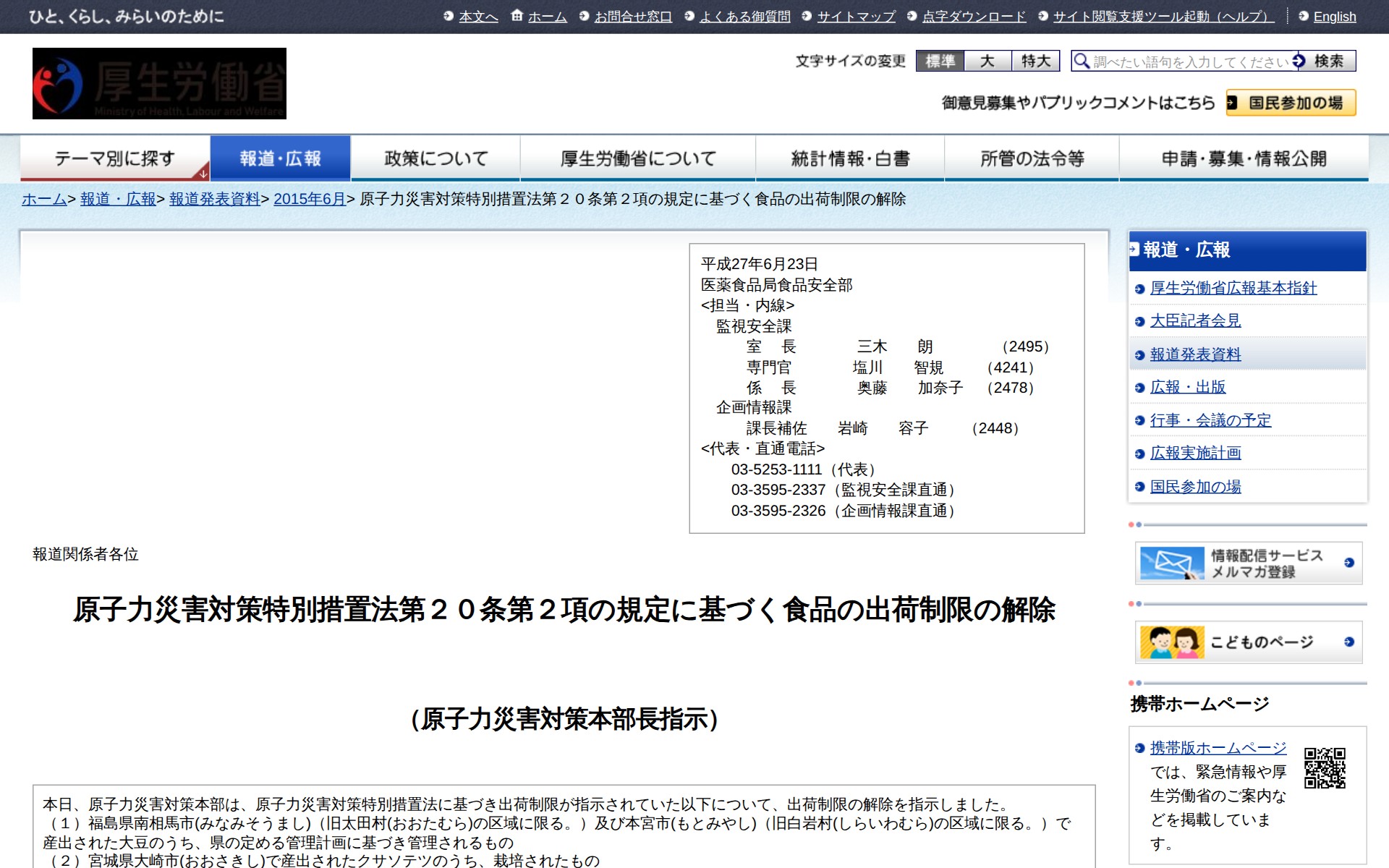原子力災害対策特別措置法第20条第2項の規定に基づく食品の出荷制限の解除 |報道発表資料|厚生労働省