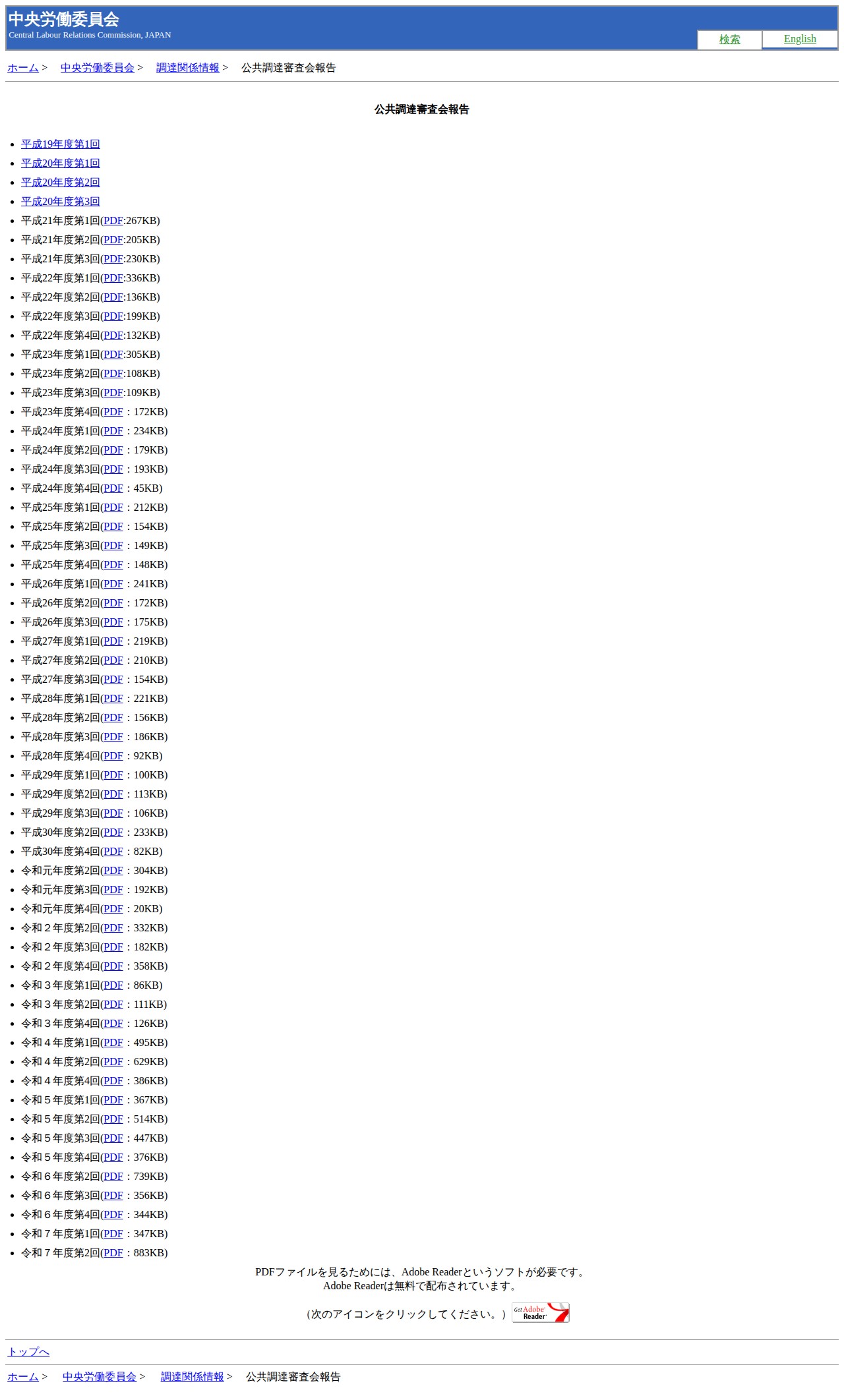 このページは、厚生労働省の中央労働委員会が公開している公共調達審査会の報告書をまとめたものです。平成19年度から令和7年度までの各年度の報告書がPDF形式で掲載されており、ユーザーはこれらの報告書にアクセスして閲覧することができます。ファイル閲覧にはAdobe Readerが必要とされています。