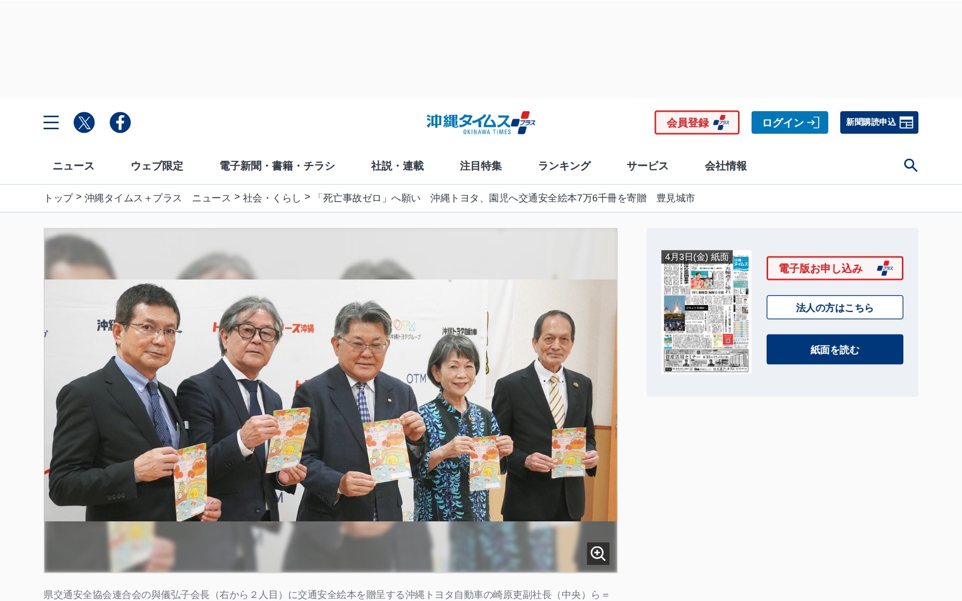 「死亡事故ゼロ」へ願い 沖縄トヨタ、園児へ交通安全絵本7万6千冊を寄贈 豊見城市 | 沖縄タイムス+プラス - 保存されたスクリーンショット