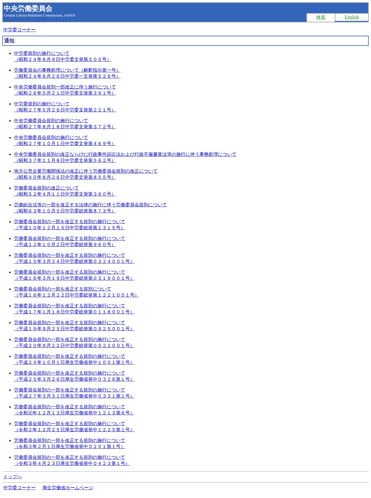 このページは、中央労働委員会が発行した各種通知をまとめたものです。昭和24年から令和3年にかけて、労働委員会規則の施行、改正、および関連法律の施行に伴う事務処理についての通知が時系列で掲載されています。地方公営企業労働関係法の改正や労働組合法の改正など、労働関係法制の変更に対応した規則改正の通知が主な内容となっています。