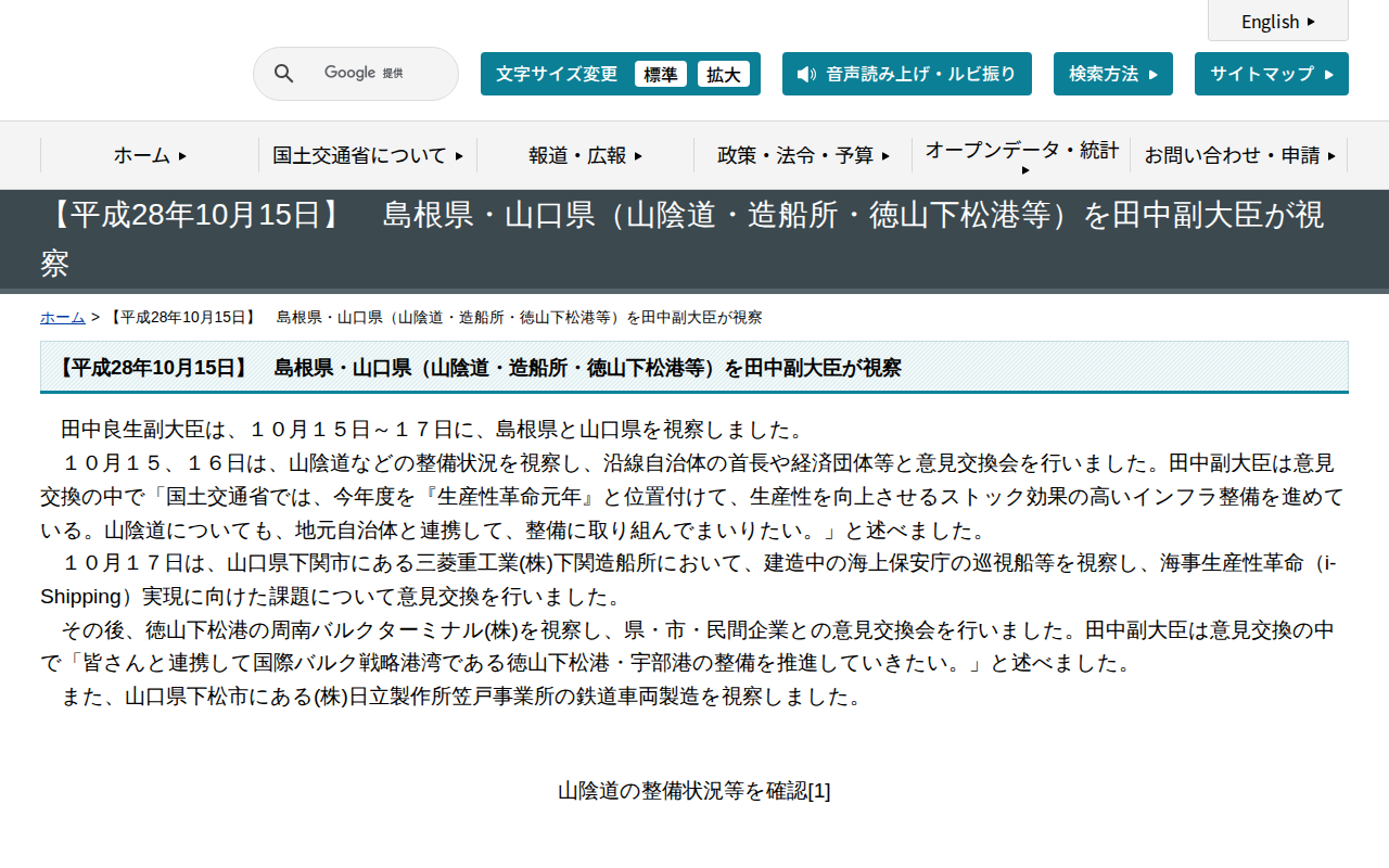 【平成28年10月15日】 島根県・山口県(山陰道・造船所・徳山下松港等)を田中副大臣が視察 - 国土交通省 - 保存されたスクリーンショット