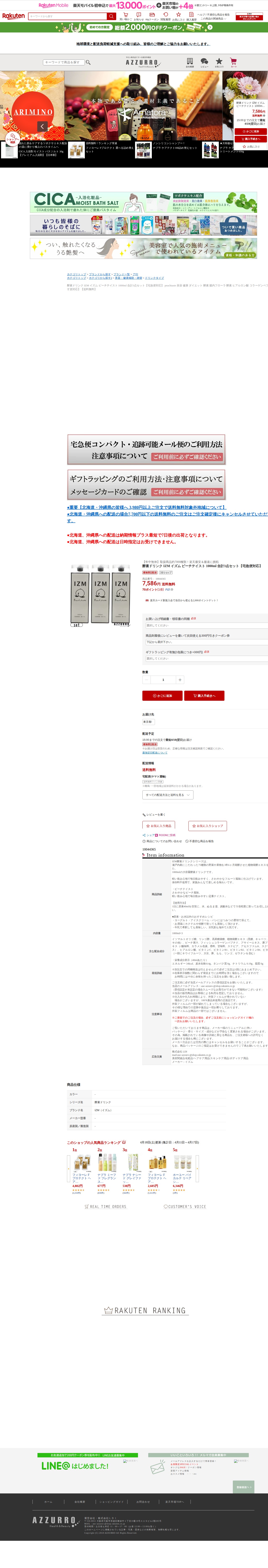 このページは、楽天市場で販売されているIZM酵素ドリンク ピーチテイスト1000ml 3点セットの商品ページです。瀬戸内産にこだわった75種類の野菜や果物を3年6ヶ月発酵させた植物発酵エキスを配合した大容量酵素ドリンクで、価格は7,586円(送料無料)です。軽い飲み心地のさわやかなピーチ風味で、保存料不使用です。1日40mlを目安に水や炭酸水で5倍程度に割って飲用するほか、ヨーグルトやアイスクリーム、カクテルなど様々な用途での利用が可能です。