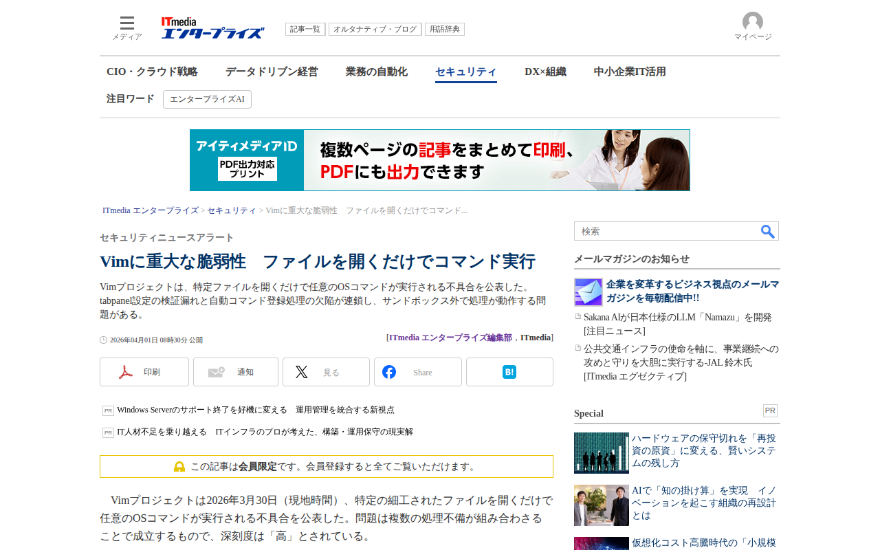 Vimに重大な脆弱性 ファイルを開くだけでコマンド実行:セキュリティニュースアラート - ITmedia エンタープライズ - 保存されたスクリーンショット