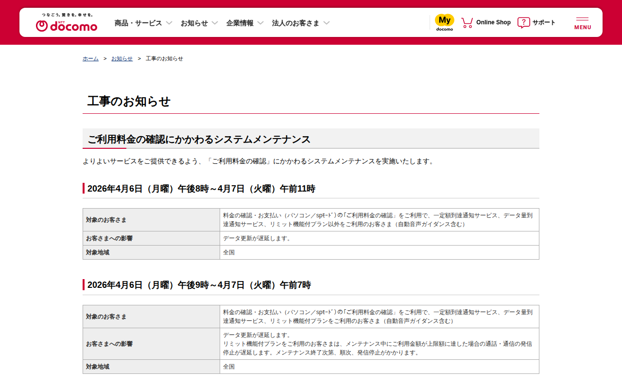 工事のお知らせ : ご利用料金の確認にかかわるシステムメンテナンス | お知らせ | NTTドコモ