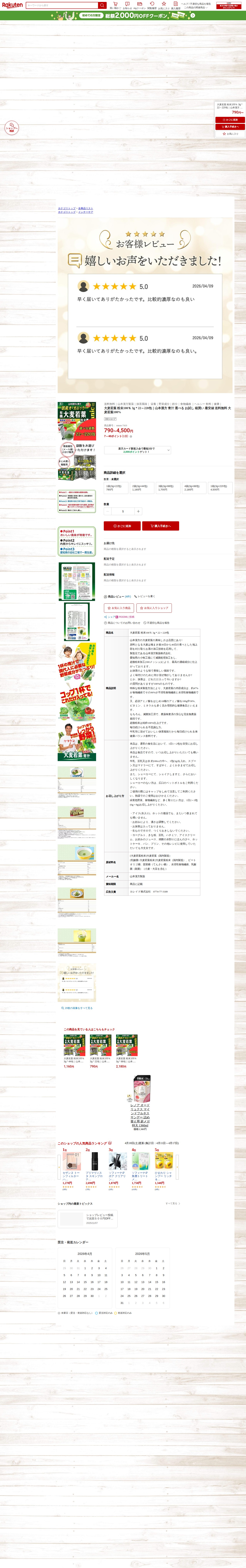 このページは、山本漢方製薬の大麦若葉粉末100%商品の楽天市場での販売ページです。種まき後30~40日の大麦若葉を収穫し、特殊な超微粉末加工により製造されています。食物繊維約47%、18種類のアミノ酸、ビタミン、ミネラルを含む健康食品です。無農薬栽培で滅菌加工済み。抹茶風味で牛乳や豆乳に混ぜて飲用します。22包790円から220包4,500円まで複数パッケージから選択可能です。1日1~2包の摂取が目安です。