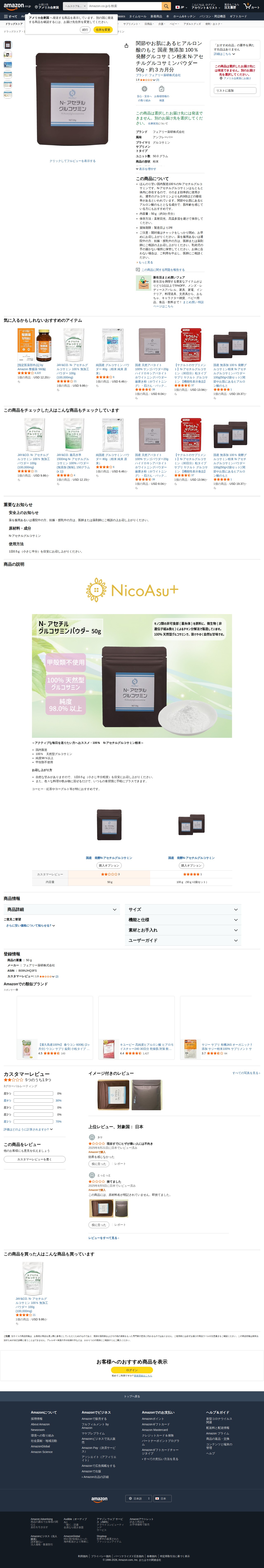 Amazon | 関節やお肌にあるヒアルロン酸のもと 国産 無添加 100% 発酵グルコサミン粉末 N-アセチルグルコサミンパウダー 50g・約3カ月分 | フェアリー薬研株式会社 | グルコサミン - 保存されたスクリーンショット