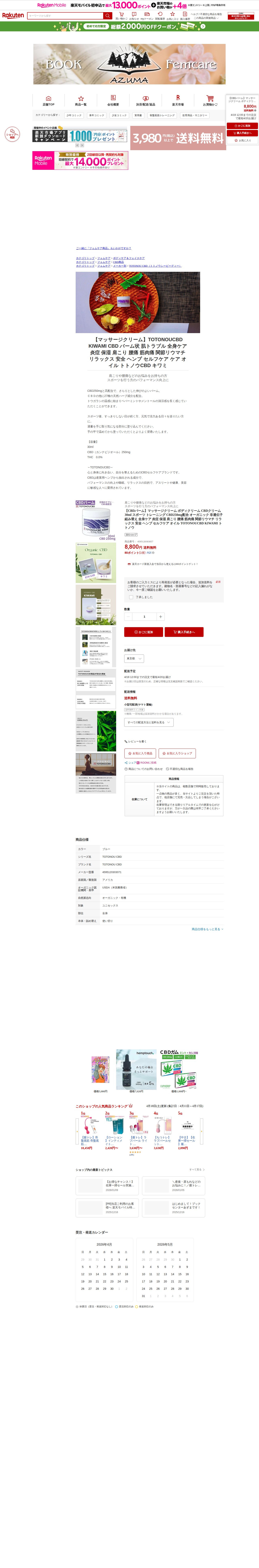 【楽天市場】【CBDバーム】マッサージクリーム ボディクリーム CBDクリーム 30ml スポーツ トレーニング CBD250mg配合 オーガニック 非遺伝子組み替え 全身ケア 炎症 保湿 肩こり 腰痛 筋肉痛 関節リウマチ リラックス 安全 ヘンプ セルフケア オイル TOTONOUCBD KIWAMI トトノウ:ブックセンターあずま 楽天市場店 - 保存されたスクリーンショット