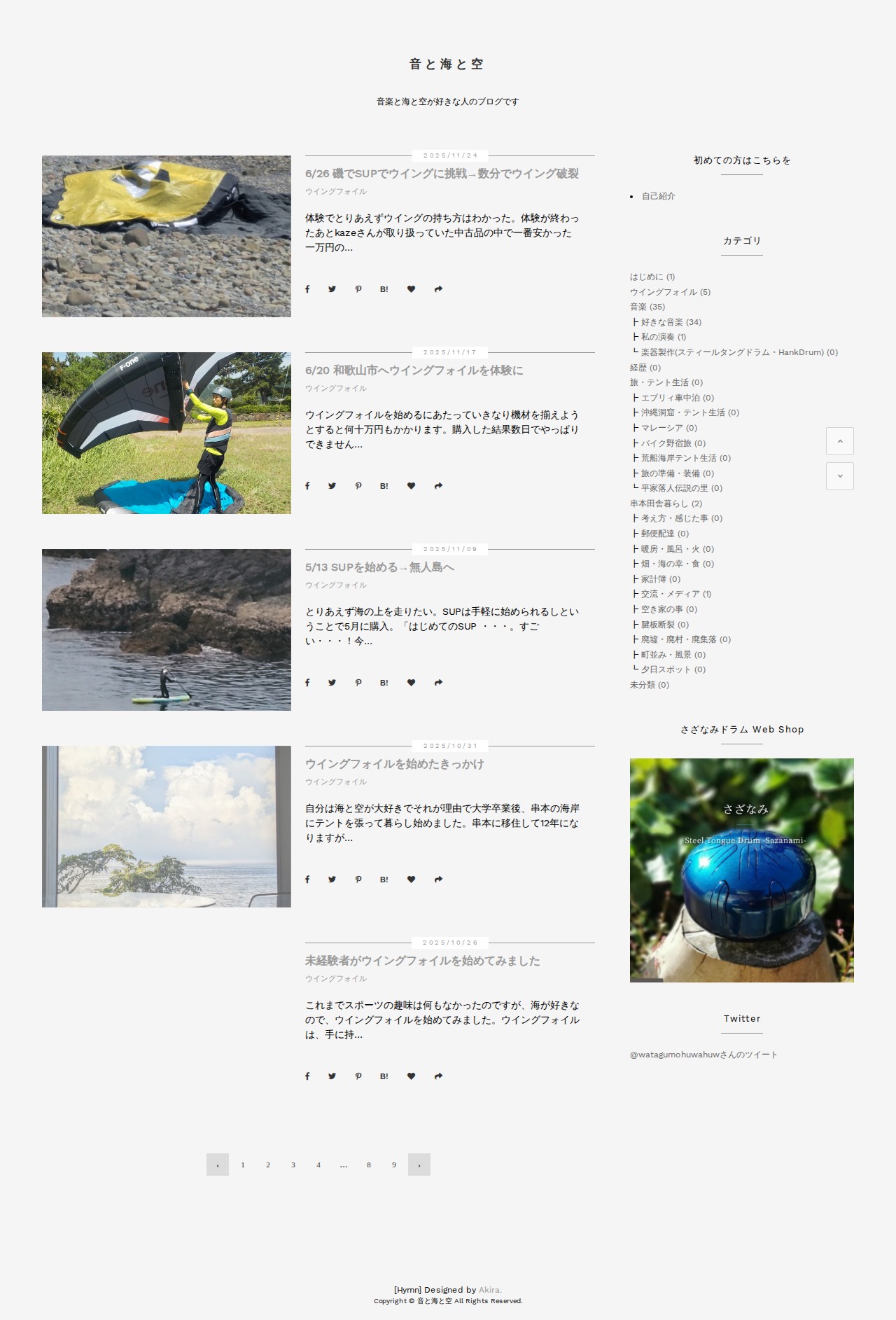 このページは、音楽と海と空を愛する人物のブログトップページです。著者は串本に移住して12年間テント生活を送りながら、ウイングフォイルやSUPなどの海上スポーツに挑戦した経験を記録しています。ブログには音楽、ウイングフォイル、旅、串本での田舎暮らしなど多様なカテゴリーの記事があります。未経験から始めたウイングフォイルの体験記や、海での活動、音楽に関する投稿が主な内容となっています。