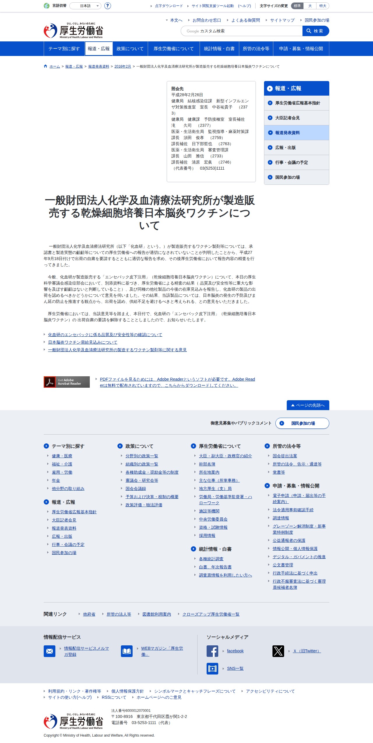 一般財団法人化学及血清療法研究所が製造販売する乾燥細胞培養日本脳炎ワクチンについて|厚生労働省 - 保存されたスクリーンショット