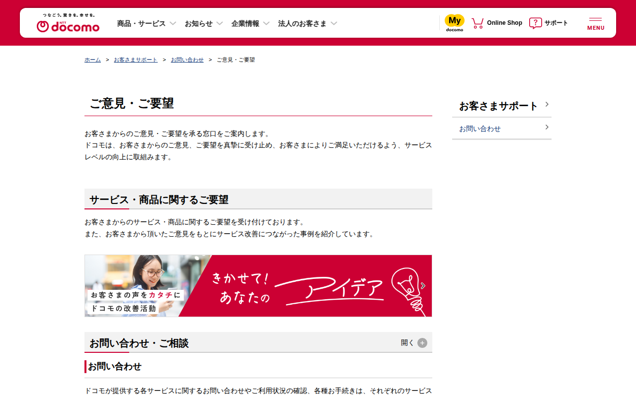 ご意見・ご要望 | お問い合わせ | お客さまサポート | NTTドコモ