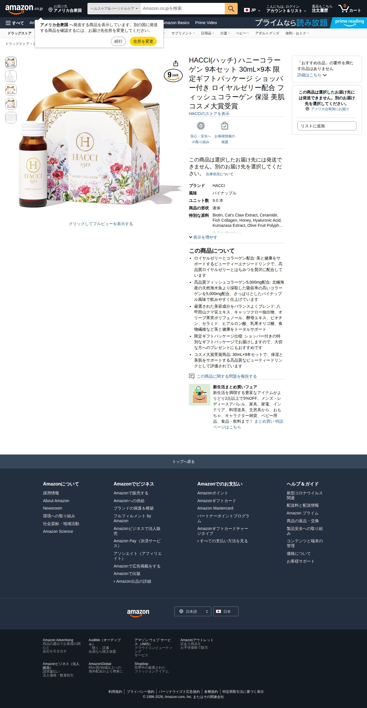 Amazon | HACCI(ハッチ) ハニーコラーゲン 9本セット 30mL×9本 限定ギフトパッケージ ショッパー付き ロイヤルゼリー配合 フィッシュコラーゲン 保湿 美肌 コスメ大賞受賞 | HACCI | コラーゲン