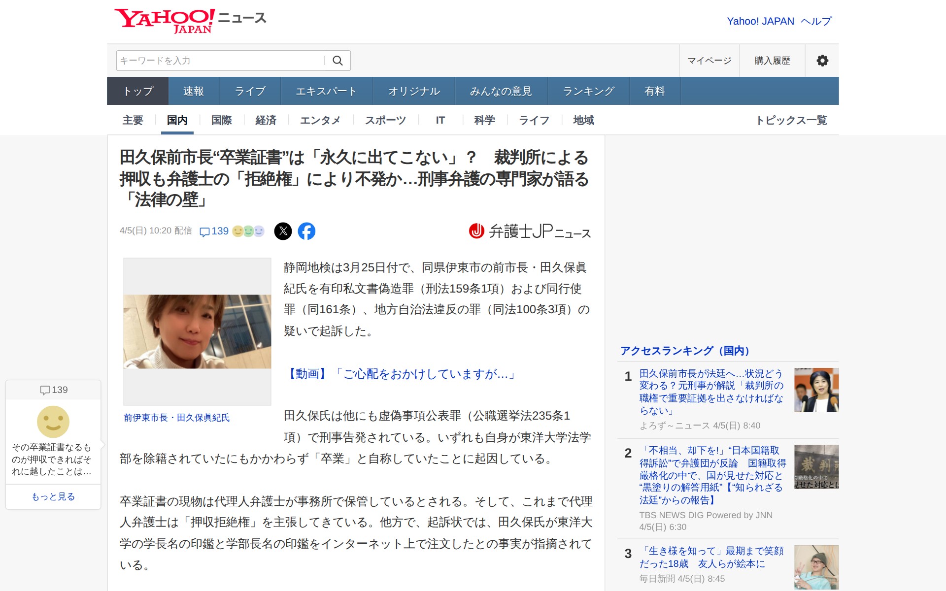 田久保前市長“卒業証書”は「永久に出てこない」? 裁判所による押収も弁護士の「拒絶権」により不発か…刑事弁護の専門家が語る「法律の壁」(弁護士JPニュース) - Yahoo!ニュース - 保存されたスクリーンショット