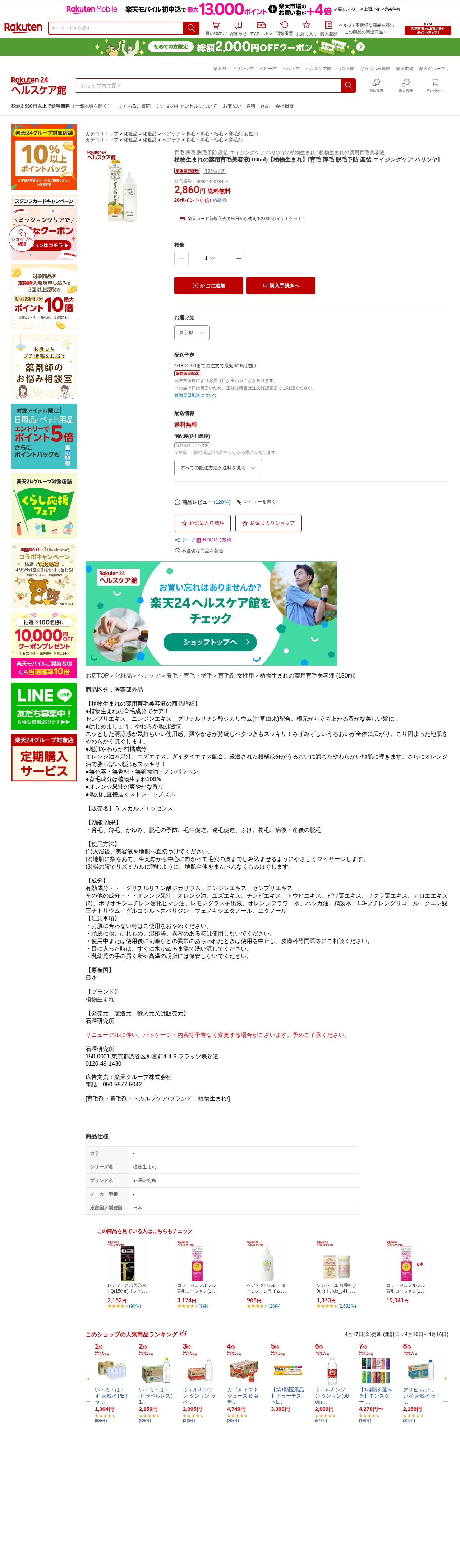【楽天市場】植物生まれの薬用育毛美容液(180ml)【植物生まれ】[育毛 薄毛 脱毛予防 産後 エイジングケア ハリツヤ]:楽天24 ヘルスケア館 - 保存されたスクリーンショット