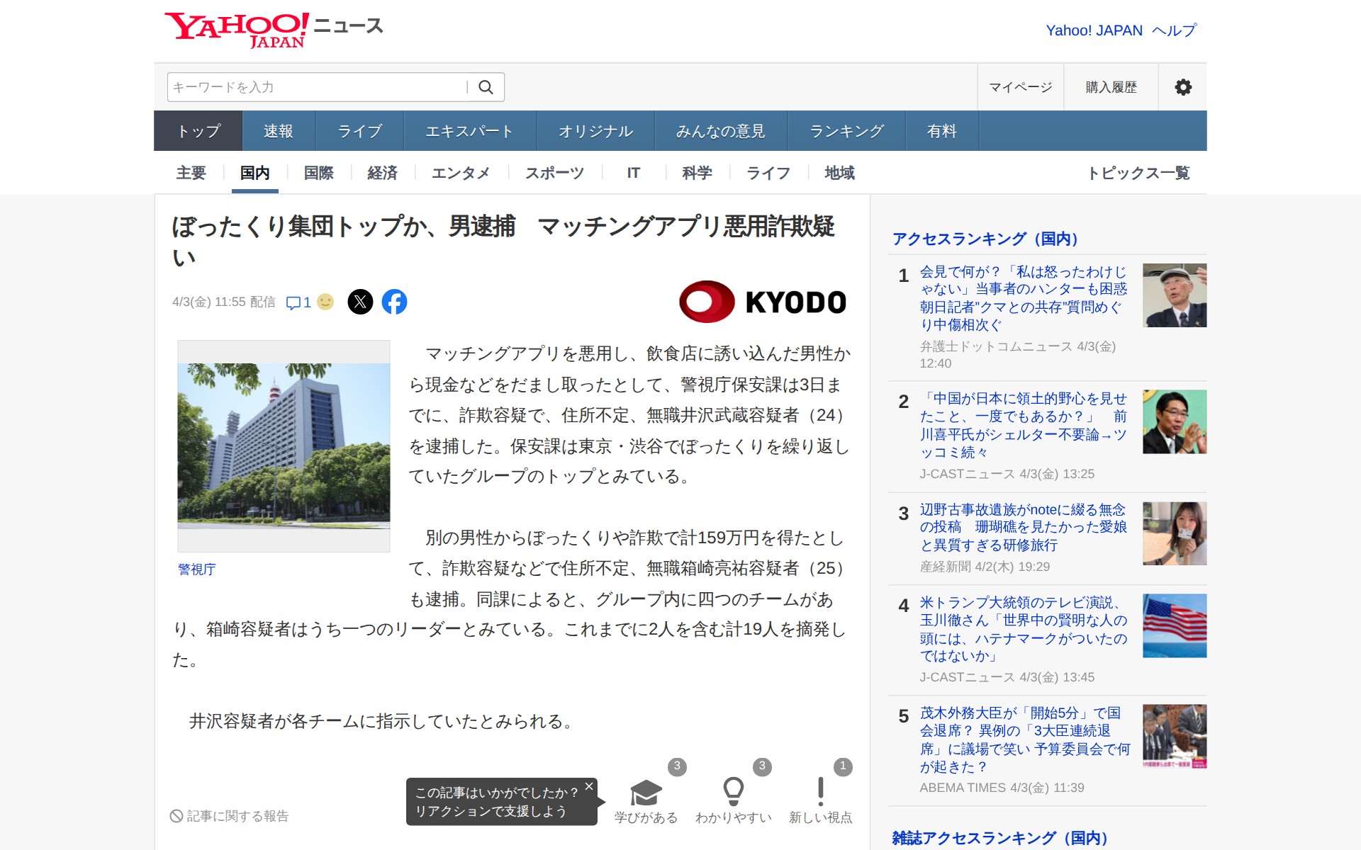 ぼったくり集団トップか、男逮捕 マッチングアプリ悪用詐欺疑い(共同通信) - Yahoo!ニュース
