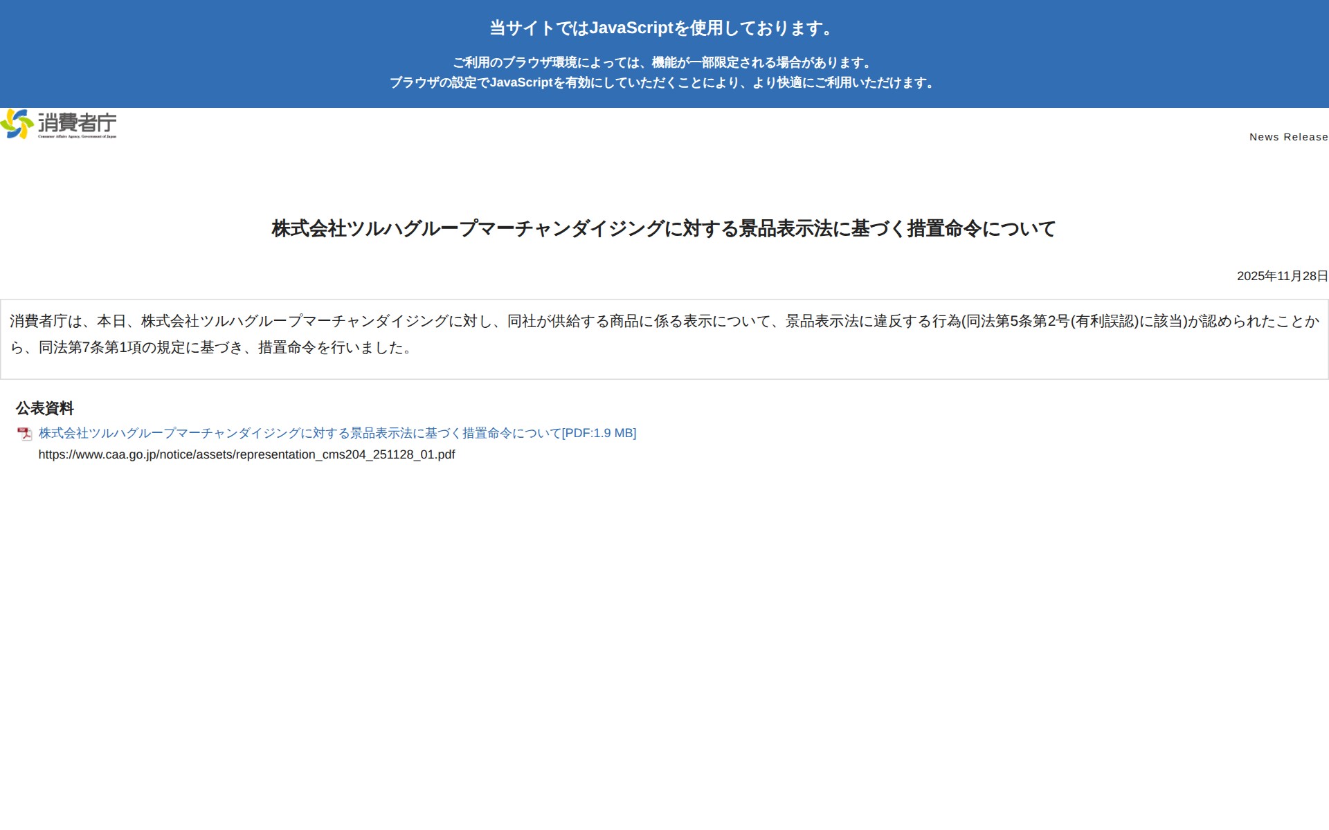 株式会社ツルハグループマーチャンダイジングに対する景品表示法に基づく措置命令について | 消費者庁 - 保存されたスクリーンショット