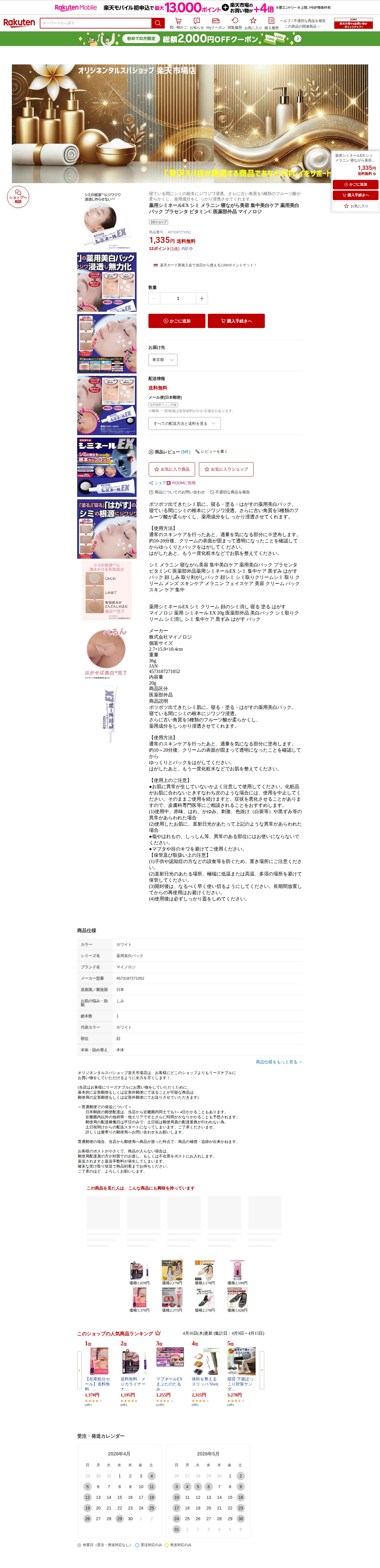 このページは、楽天市場で販売されている「薬用シミネールEX」という医薬部外品の薬用美白パックの商品ページです。価格は1,335円で送料無料。マイノロジ製で、内容量は20g。寝ている間にシミの根本に浸透し、5種類のフルーツ酸が古い角質を柔らかくして薬用成分をしっかり浸透させます。プラセンタとビタミンC配合。使用方法は、スキンケア後に気になる部分に塗布し、10~20分後に固まった表面を確認してからはがします。肌トラブルが生じた場合の使用中止など、使用上の注意も記載されています。