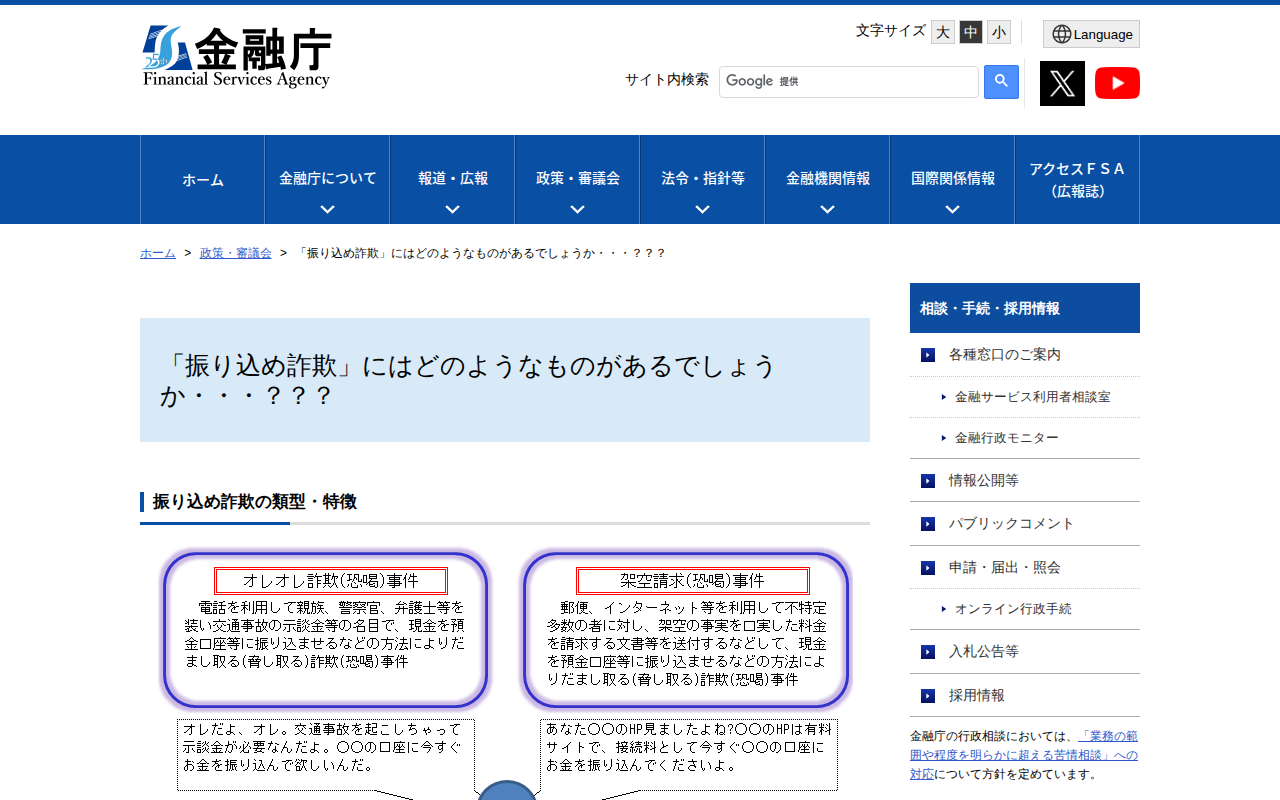 「振り込め詐欺」にはどのようなものがあるでしょうか・・・???:金融庁 - 保存されたスクリーンショット