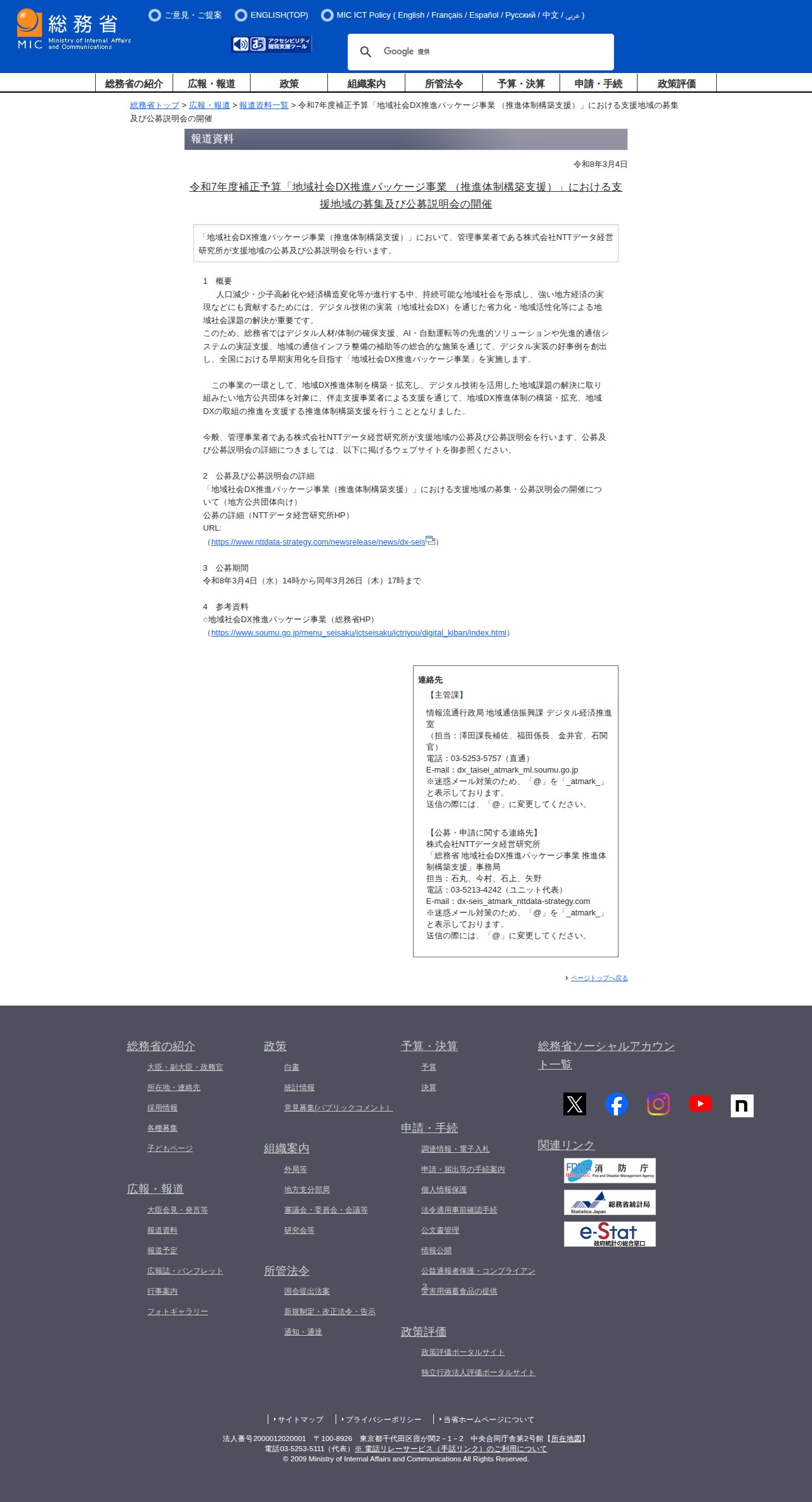 総務省|報道資料|令和7年度補正予算「地域社会DX推進パッケージ事業 (推進体制構築支援)」における支援地域の募集及び公募説明会の開催