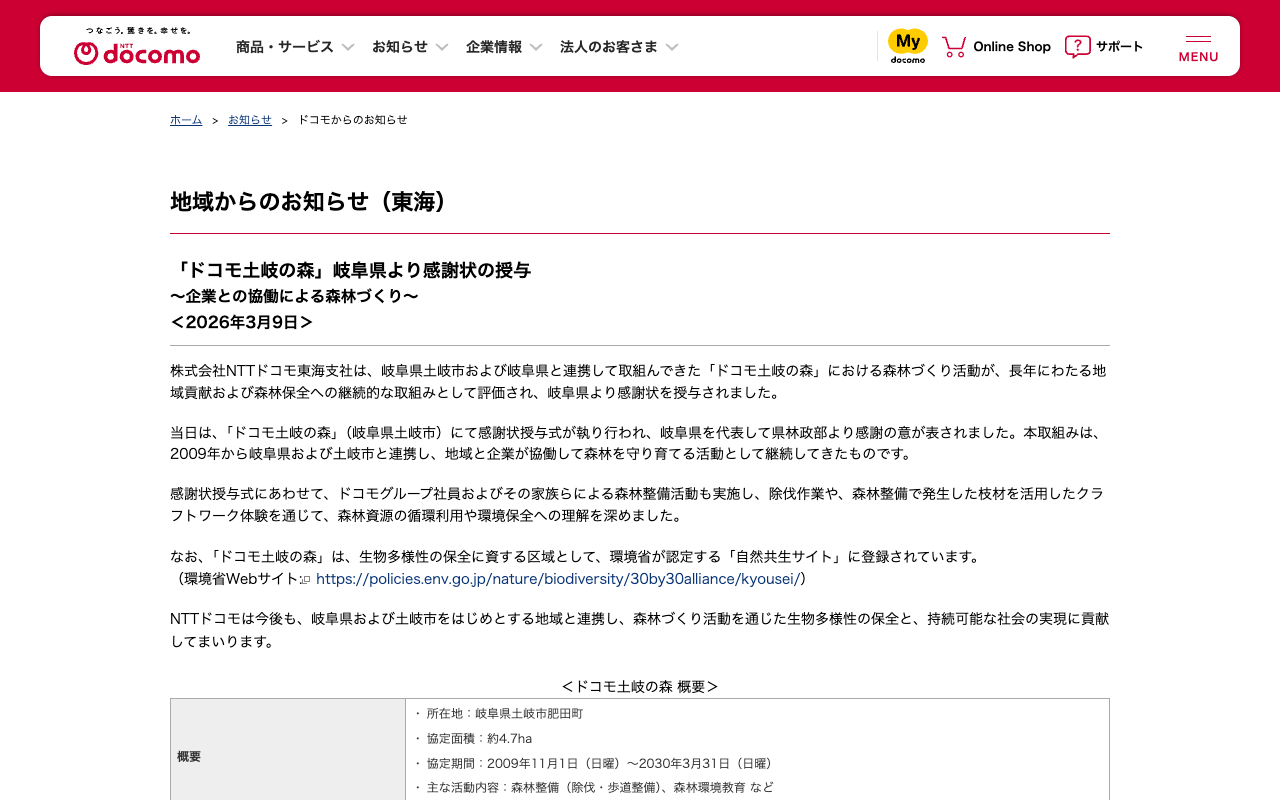 地域からのお知らせ(東海) : 「ドコモ土岐の森」岐阜県より感謝状の授与~企業との協働による森林づくり~ | お知らせ | NTTドコモ