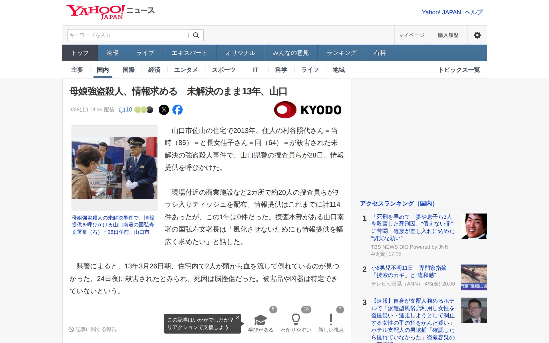 母娘強盗殺人、情報求める 未解決のまま13年、山口(共同通信) - Yahoo!ニュース