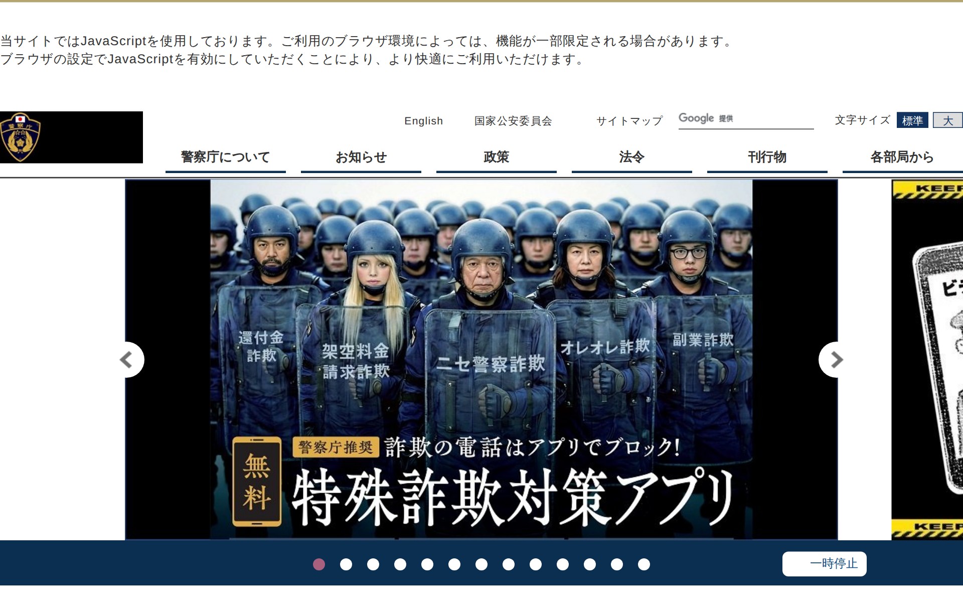 このページは、日本の警察庁の公式ウェブサイトです。警察組織の構造改革、詐欺対策、サイバーセキュリティ、交通安全、災害・テロ対策など、主要な政策と取り組みを紹介しています。特殊詐欺やストーカー問題への対策、子どもの性被害防止、暴力団・薬物対策など多様な治安維持活動に関する情報を掲載。採用情報、統計データ、報道発表、各種相談窓口も提供しており、複数のSNS公式アカウントで情報発信しています。