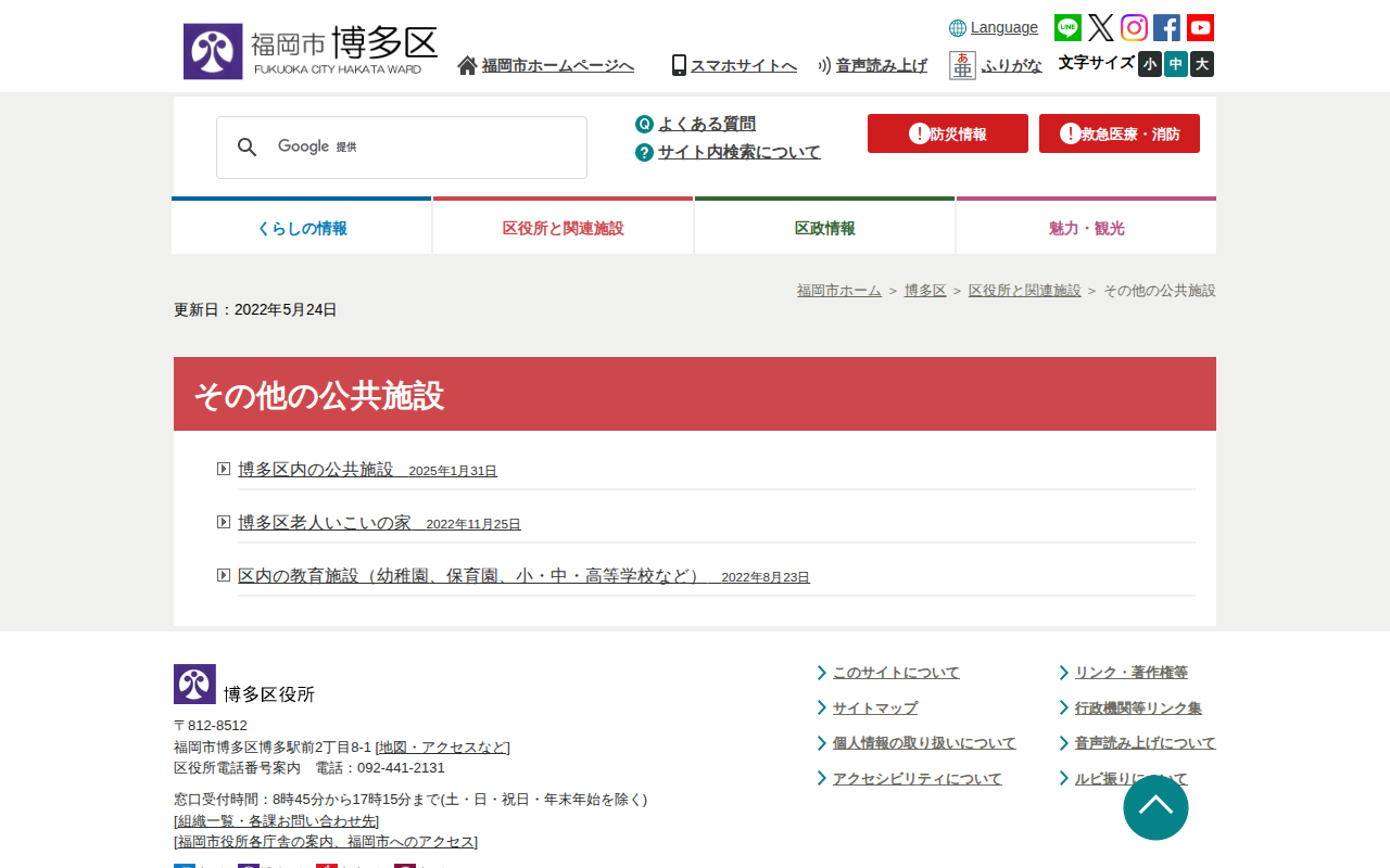 http://www.city.fukuoka.lg.jp/hakata/ha-kuyakusyo-shisetsu/etc-koukyoushisetsu.html2026年4月9日 01:21 JST•アーカイブページ・viewer・ダウンロードは、この保存版を基準に表示されます。