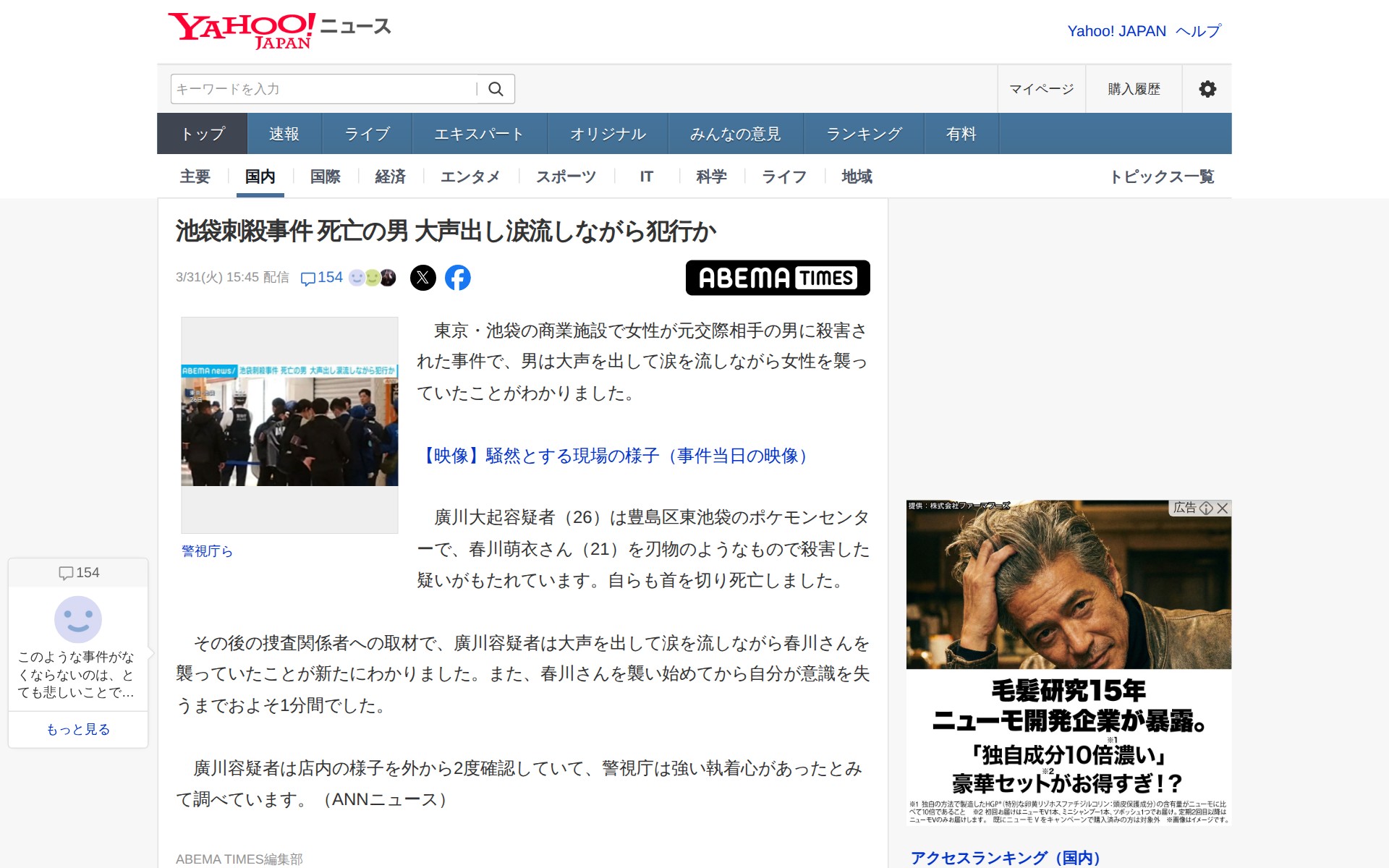 池袋刺殺事件 死亡の男 大声出し涙流しながら犯行か(ABEMA TIMES) - Yahoo!ニュース - 保存されたスクリーンショット