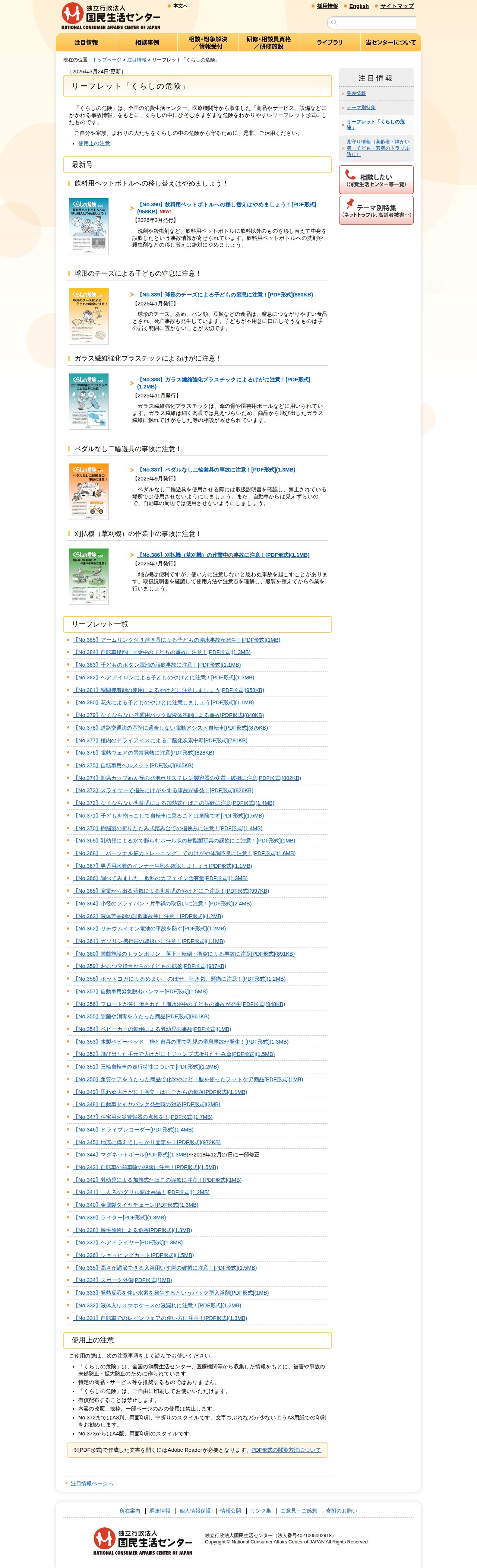 このページは、国民生活センターが発行するリーフレット「くらしの危険」について紹介しています。全国の消費生活センターや医療機関から収集した事故情報をもとに、日常生活に潜む危険をわかりやすく解説したリーフレット形式の資料です。最新号は飲料用ペットボトルへの洗剤などの移し替めによる誤飲事故、球形チーズによる窒息事故、ガラス繊維強化プラスチックによるけがなど、様々な生活関連事故の注意喚起を行っています。自分や家族を危険から守るための活用が推奨されています。