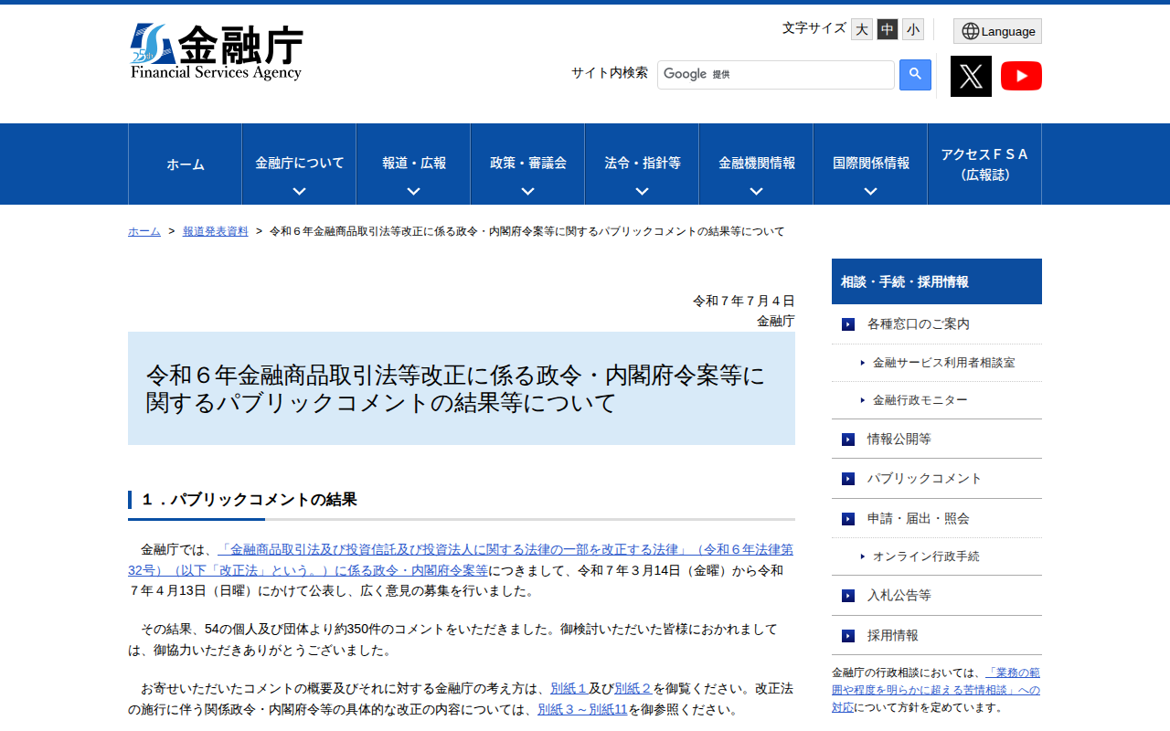 令和6年金融商品取引法等改正に係る政令・内閣府令案等に関するパブリックコメントの結果等について:金融庁
