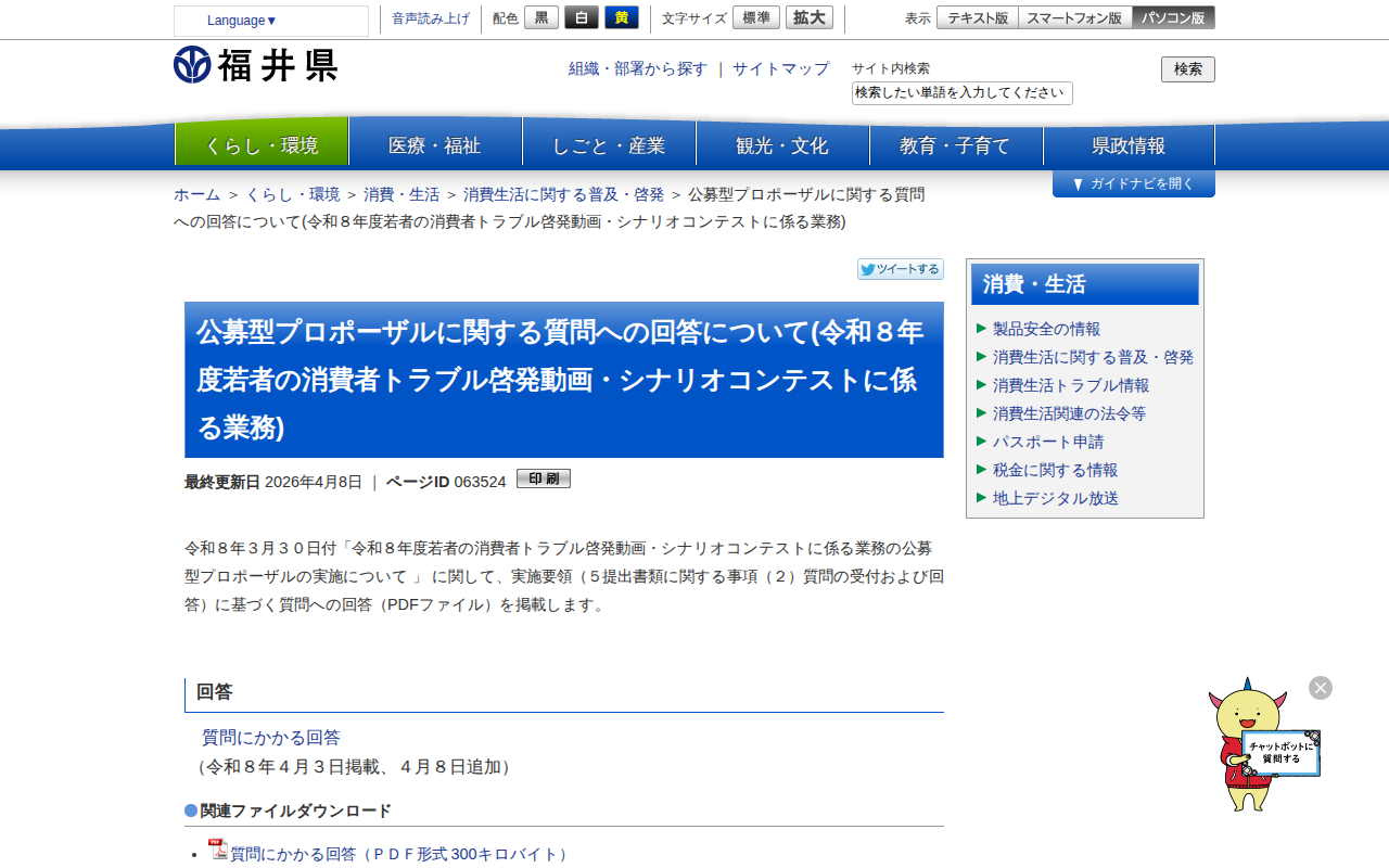 公募型プロポーザルに関する質問への回答について(令和8年度若者の消費者トラブル啓発動画・シナリオコンテストに係る業務) | 福井県ホームページ