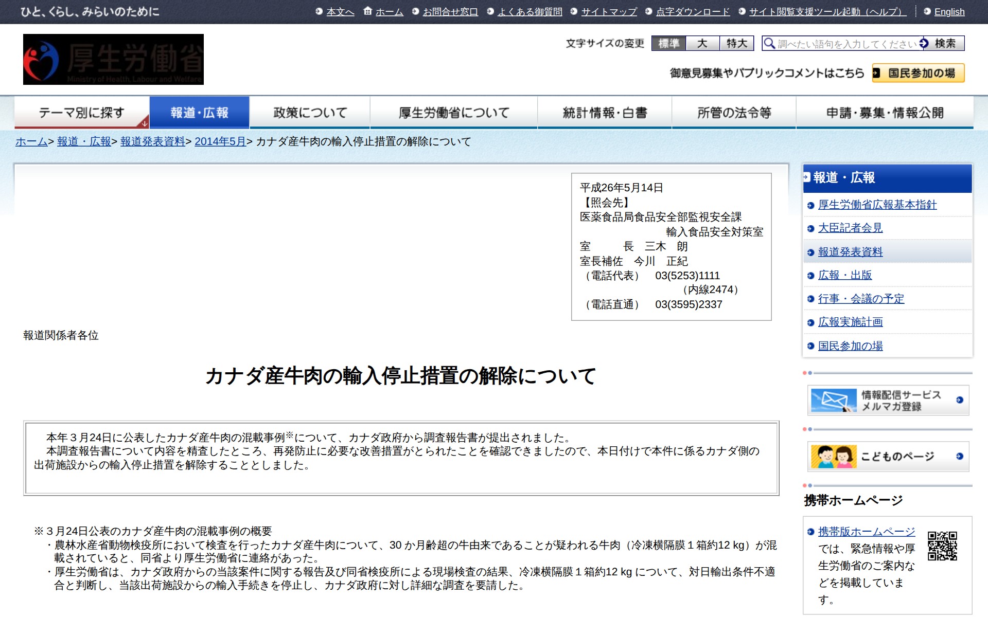 カナダ産牛肉の輸入停止措置の解除について |報道発表資料|厚生労働省