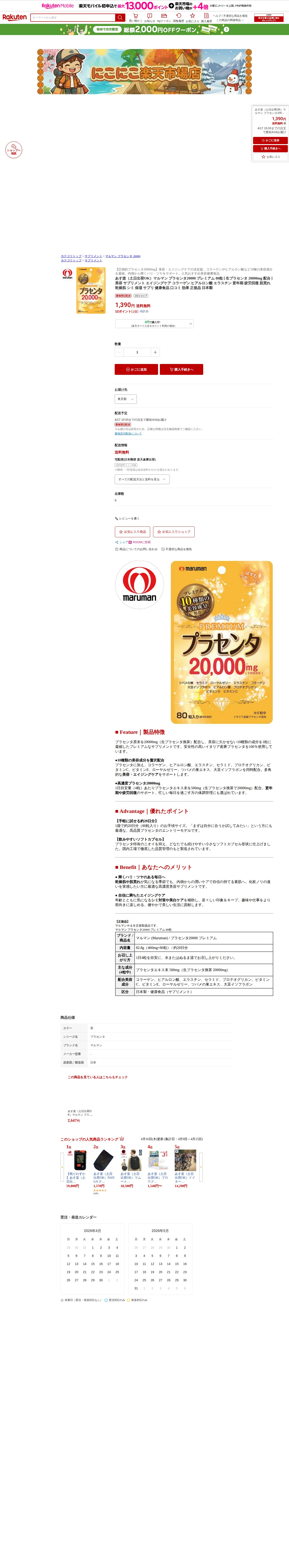 【楽天市場】あす楽(土日出荷OK)マルマン プラセンタ20000 プレミアム 80粒 [ 生プラセンタ 20000mg 配合 ] 美容 サプリメント エイジングケア コラーゲン ヒアルロン酸 エラスチン 更年期 疲労回復 肌荒れ 乾燥肌 シミ 保湿 サプリ 健康食品 口コミ 効果 正規品 日本製:にこにこ楽天市場店 - 保存されたスクリーンショット