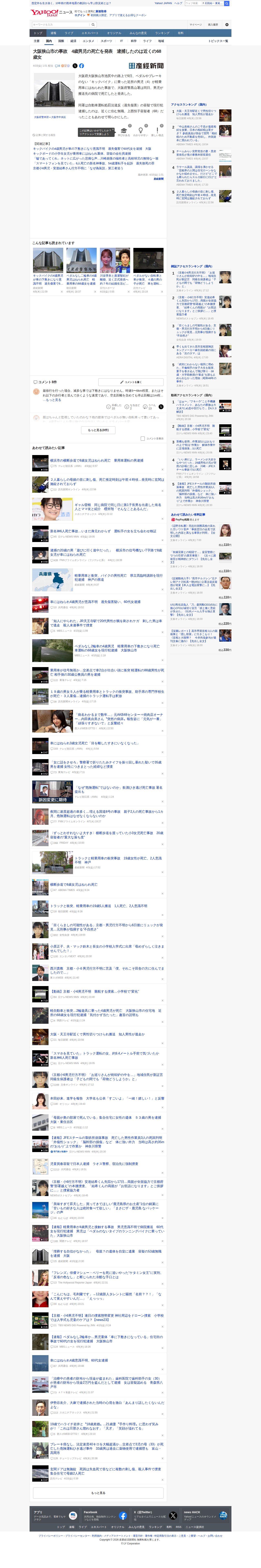 このページは、大阪狭山市で発生した交通事故のニュースを報じています。ペダルやブレーキのないキックバイクに乗った4歳の男児が軽乗用車にはねられ、病院で死亡したものです。大阪府警は自動車運転処罰法違反(過失傷害)の容疑で、近くに住む68歳の無職女性を現行犯逮捕しました。事故は4月9日に発生し、翌日に死亡が確認されています。