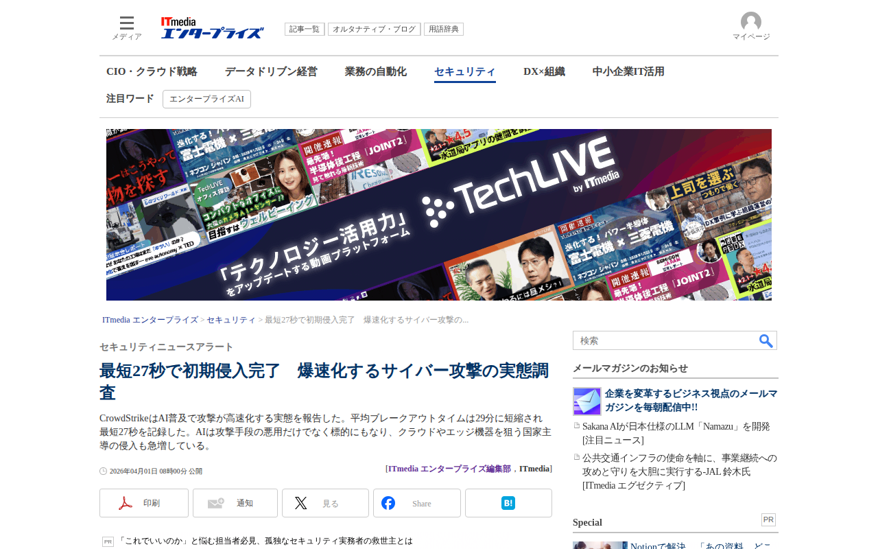 最短27秒で初期侵入完了 爆速化するサイバー攻撃の実態調査:セキュリティニュースアラート - ITmedia エンタープライズ - 保存されたスクリーンショット