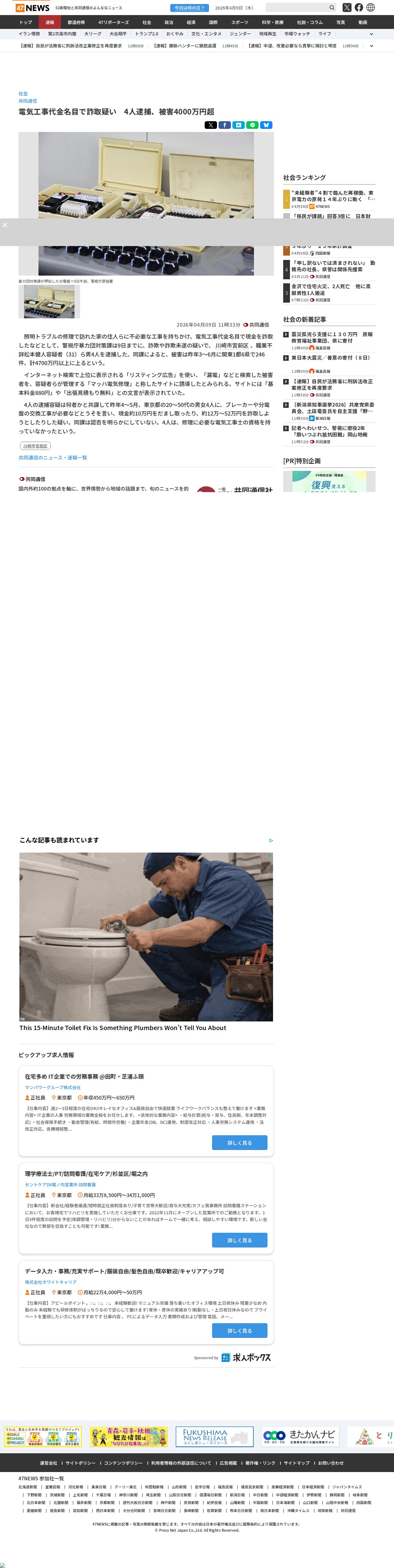 このページは、電気工事代金を名目に詐欺を行ったとして、警視庁が川崎市の男性ら4人を逮捕したニュースを報じている。容疑者らはインターネット広告を利用して漏電検査を装い、被害者を「マッハ電気修理」という架空サイトに誘導。不必要な工事を持ちかけ、現金を詐取していた。昨年3~6月に関東1都6県で246件、4700万円以上の被害が報告されている。逮捕された4人は電気工事士の資格を保有していなかった。