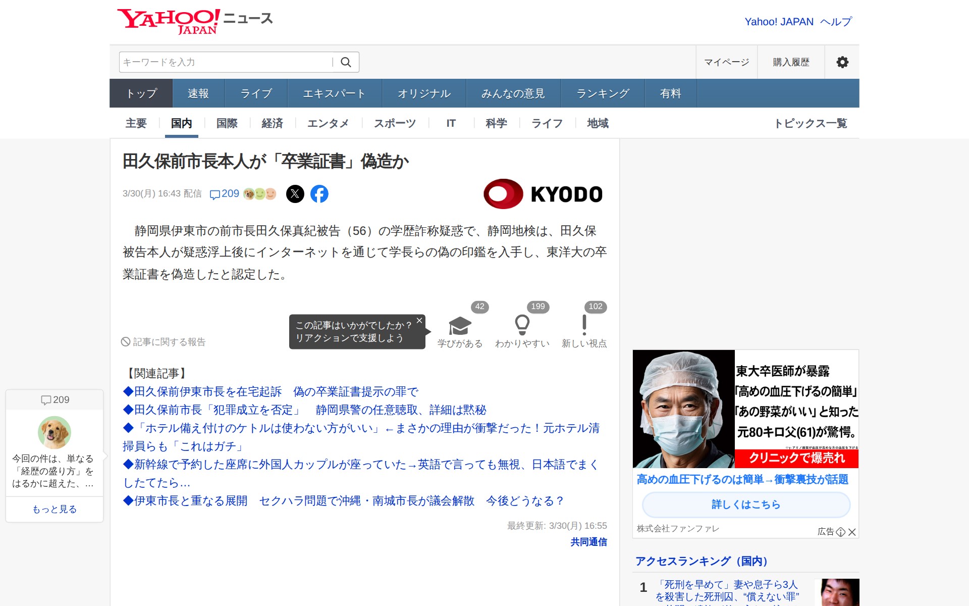 田久保前市長本人が「卒業証書」偽造か(共同通信) - Yahoo!ニュース