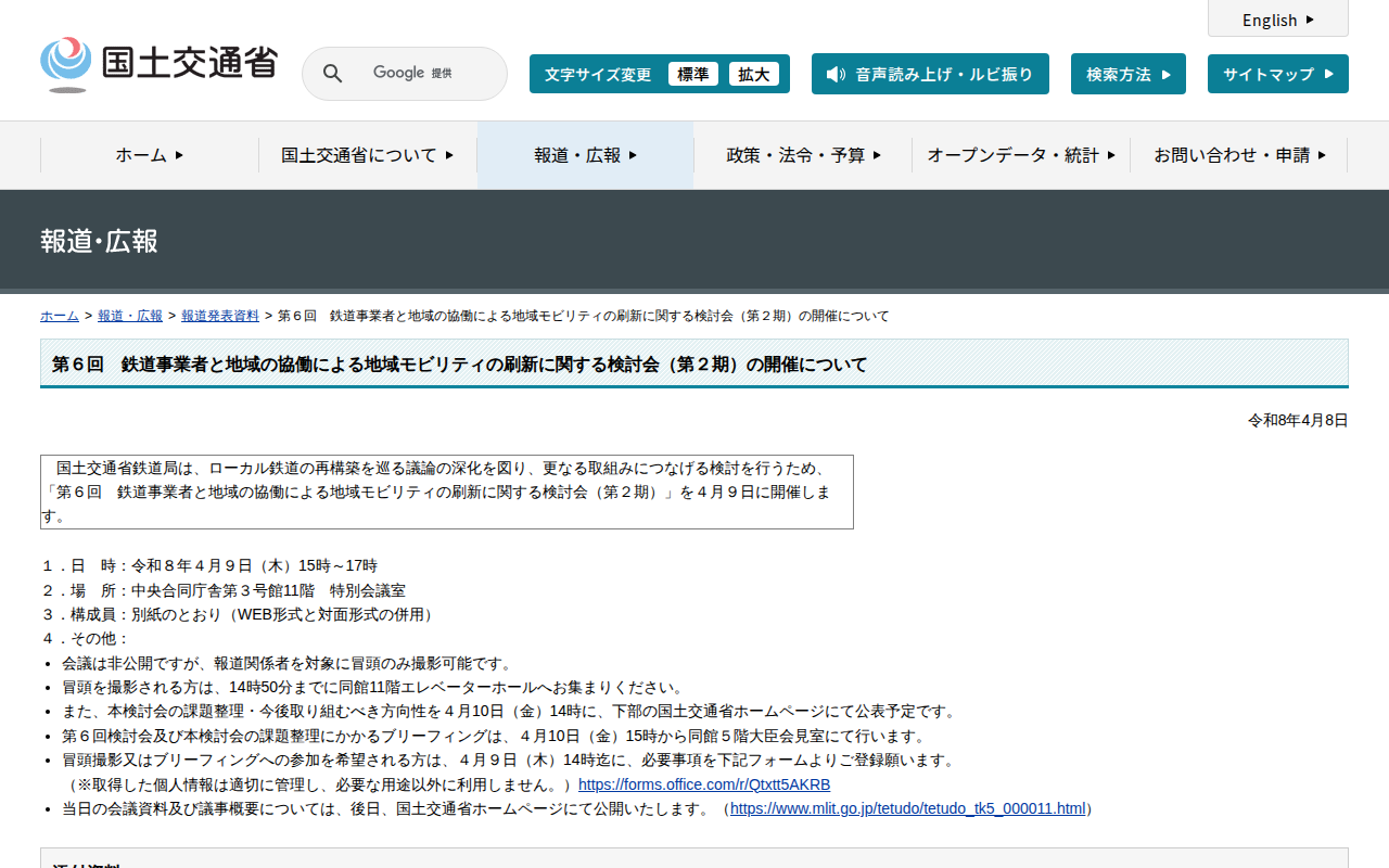 報道発表資料:第6回 鉄道事業者と地域の協働による地域モビリティの刷新に関する検討会(第2期)の開催について - 国土交通省 - 保存されたスクリーンショット