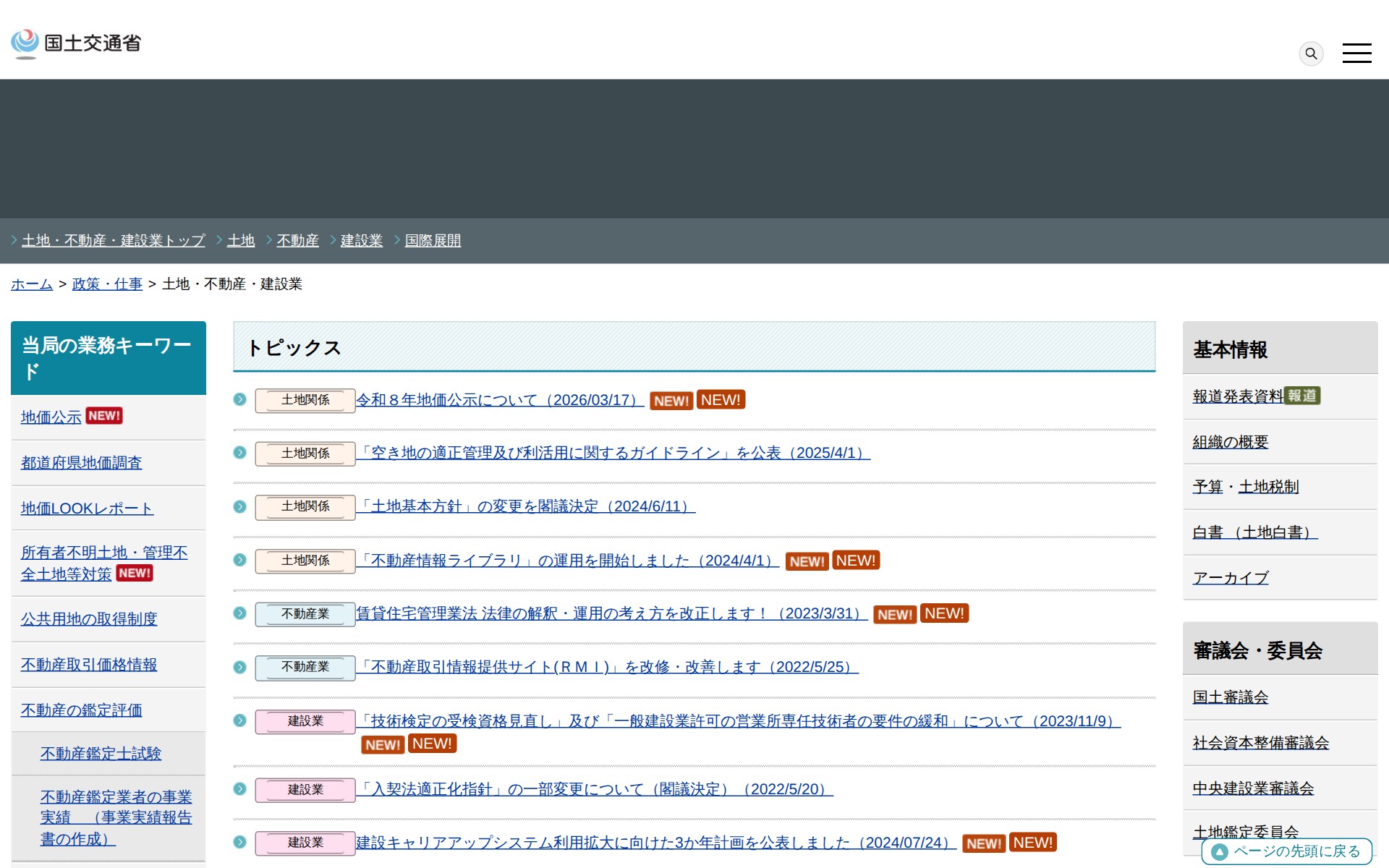 このページは、国土交通省の土地・不動産・建設業に関する総合窓口です。土地政策では地価公示や空き地対策、地籍整備などを扱い、不動産業では宅地建物取引業やマンション管理業などの規制・支援を行っています。建設業関係では許可制度、入札契約制度、技術検定、労働対策などを管理しています。また国際展開支援として、海外建設・不動産市場データベースや企業支援も提供しています。各分野の最新情報、制度・施策、ガイドラインなど幅広い情報を発信しています。