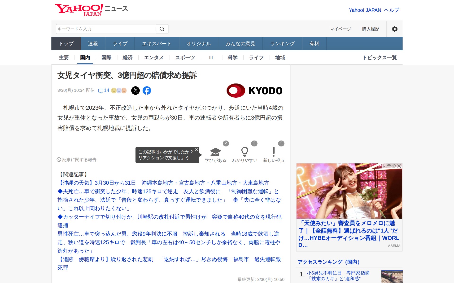 女児タイヤ衝突、3億円超の賠償求め提訴(共同通信) - Yahoo!ニュース - 保存されたスクリーンショット