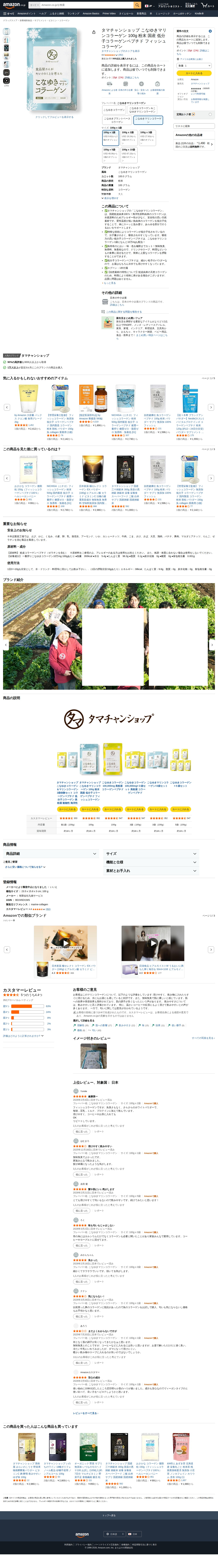 このページはタマチャンショップの「こなゆきマリンコラーゲン」という粉末状のコラーゲンサプリメント商品を紹介しています。100g入りで、国産鮭皮由来の低分子フィッシュコラーゲンペプチドを使用しています。4.4つ星の評価で、過去1か月で600点以上購入されており、Amazonでの販売価格は1,490円です。複数サイズオプション(1袋から10袋セット)が用意されており、安心・安全への取り組みが明記されています。