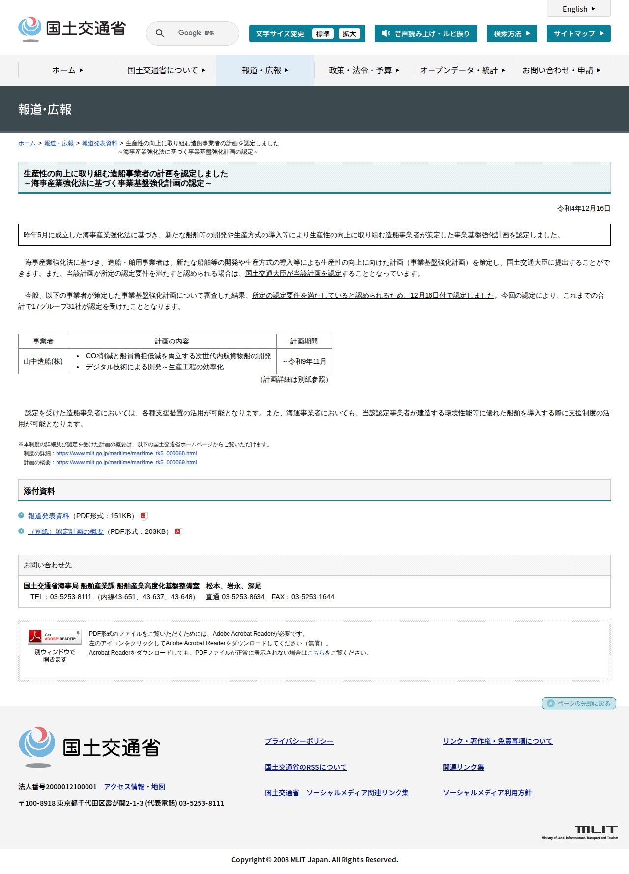 報道発表資料:生産性の向上に取り組む造船事業者の計画を認定しました<br>~海事産業強化法に基づく事業基盤強化計画の認定~ - 国土交通省