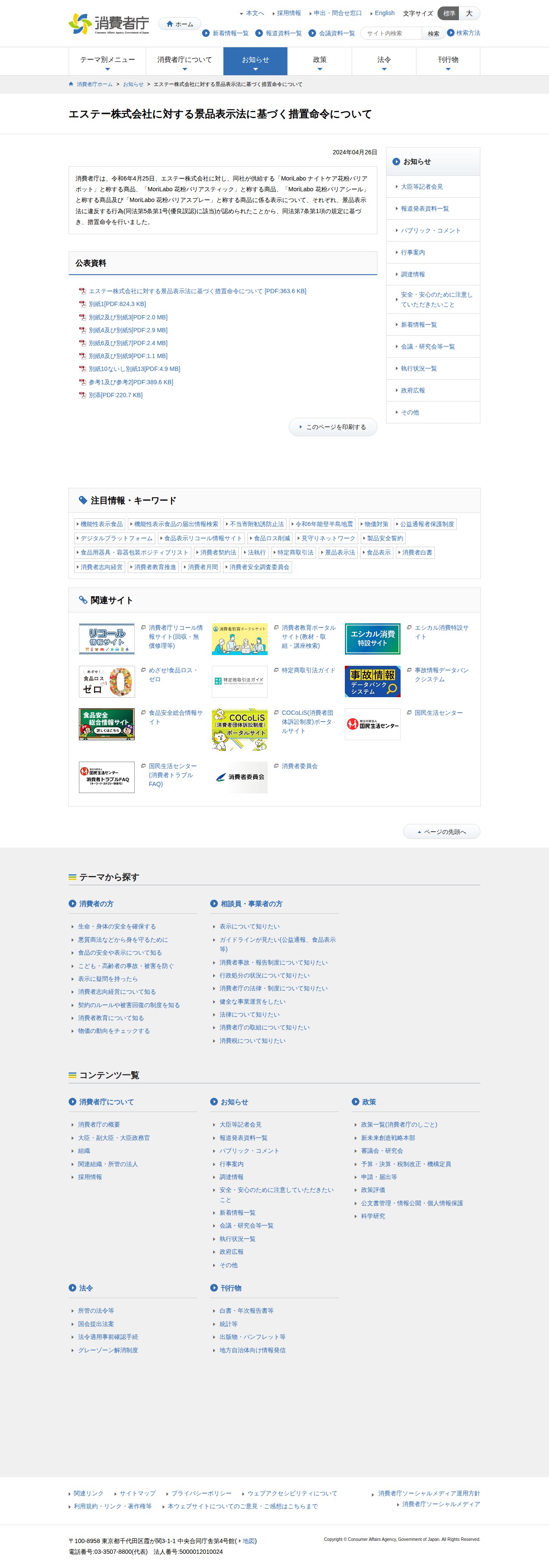 エステー株式会社に対する景品表示法に基づく措置命令について | 消費者庁 - 保存されたスクリーンショット