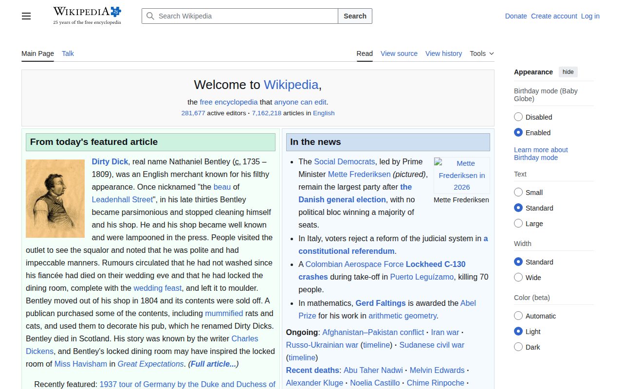 このページはWikipediaのメインページです。誰もが編集できる無料の百科事典で、281,677人のアクティブな編集者により7,162,218の英語記事が提供されています。本文では、本日の注目記事として18世紀のイギリス商人ダーティ・ディック(ナサニエル・ベントリー)が紹介されています。彼は極度に不潔な外見で知られ、婚約者が結婚式前夜に亡くなったという伝説があります。彼の物語はチャールズ・ディケンズに知られ、『大いなる遺産』のハヴィシャム嬢の鍵をかけた部屋のインスピレーションになった可能性があります。