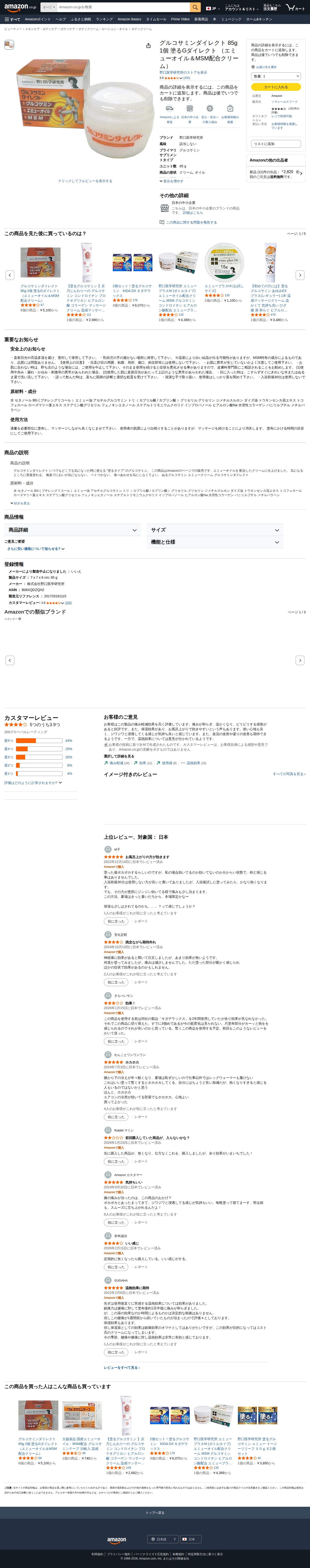 このページは、野口医学研究所が販売するグルコサミン配合の塗るクリーム商品の詳細ページです。内容量85gで、エミューオイルとMSM配合のボディクリーム・ローション・オイルです。星3.9の評価を受けており、Amazon発送で初回送料無料です。日本の中小企業ブランドの製品で、大人向けのスキンケア・ボディケア商品として分類されています。