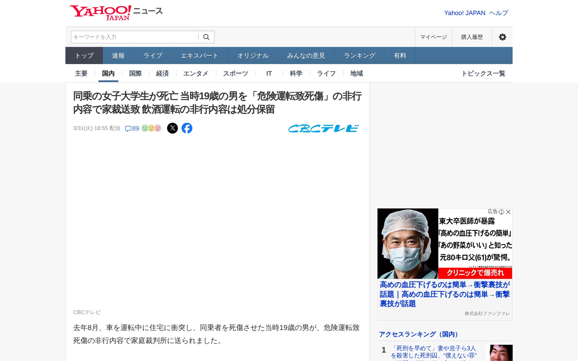 同乗の女子大学生が死亡 当時19歳の男を「危険運転致死傷」の非行内容で家裁送致 飲酒運転の非行内容は処分保留(CBCテレビ) - Yahoo!ニュース - 保存されたスクリーンショット